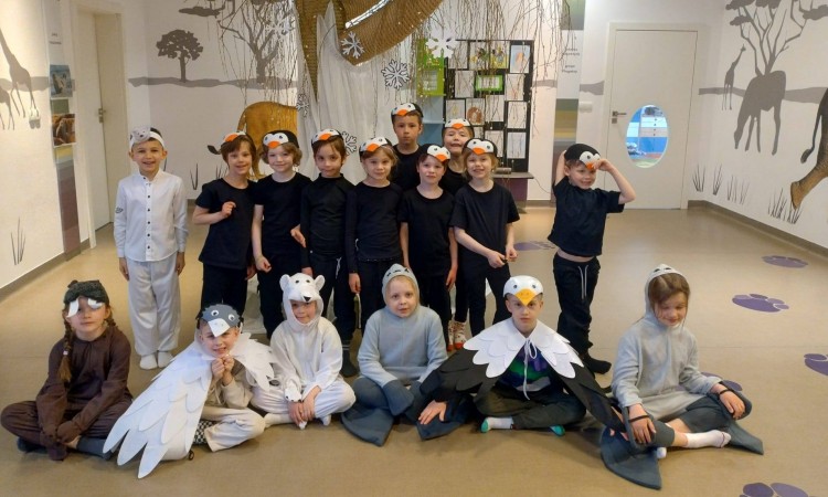 W ramach projektu Mały Europejczyk zwiedza świat, dzieci podróżowały na Antarktydę i Arktykę . Poznały zwierzęta, które zamieszkują to miejsce: pingwiny, foki, słonie morskie, niedźwiedzie polarne i wydrzyki. Najstarsza grupa, która przygotowywała przedstawienie, przekazała przedszkolakom kilka ciekawostek oraz zatańczyła energiczny taniec. Bardzo dziękujemy Pani Kindze za przygotowanie strojów oraz choreografii na ten wyjątkowy dzień.