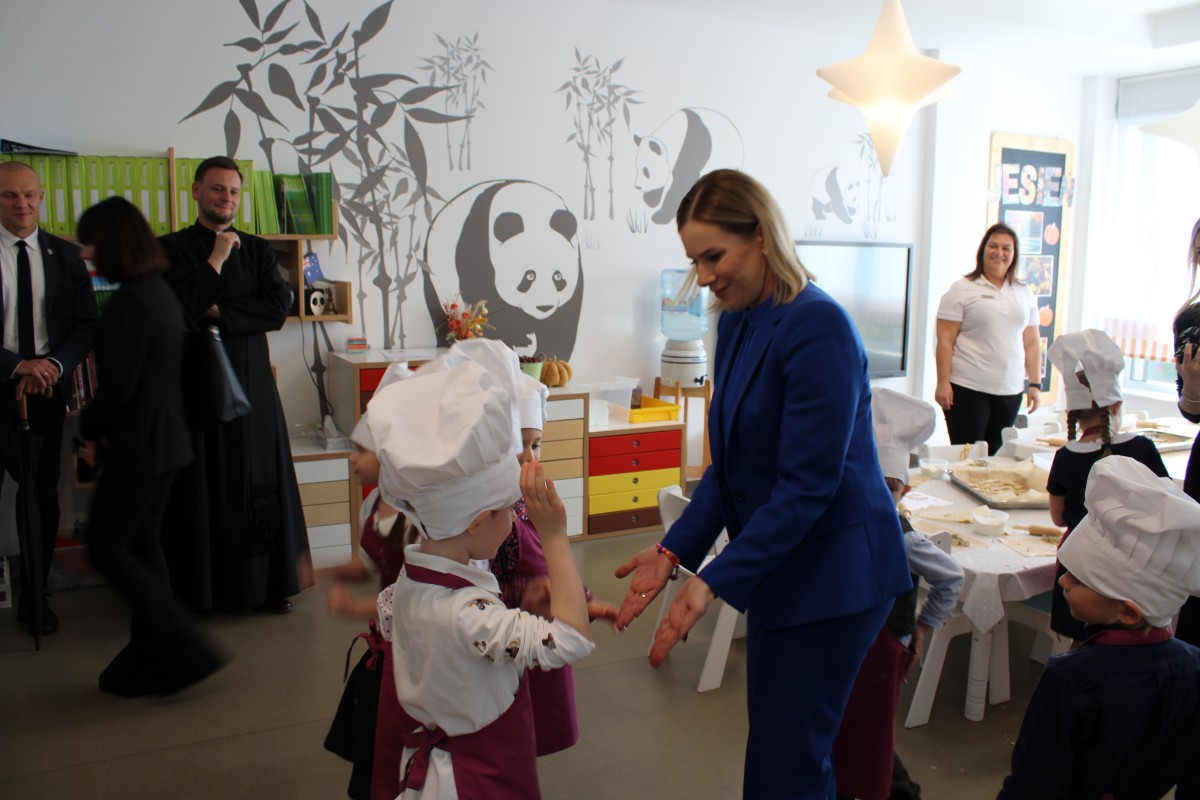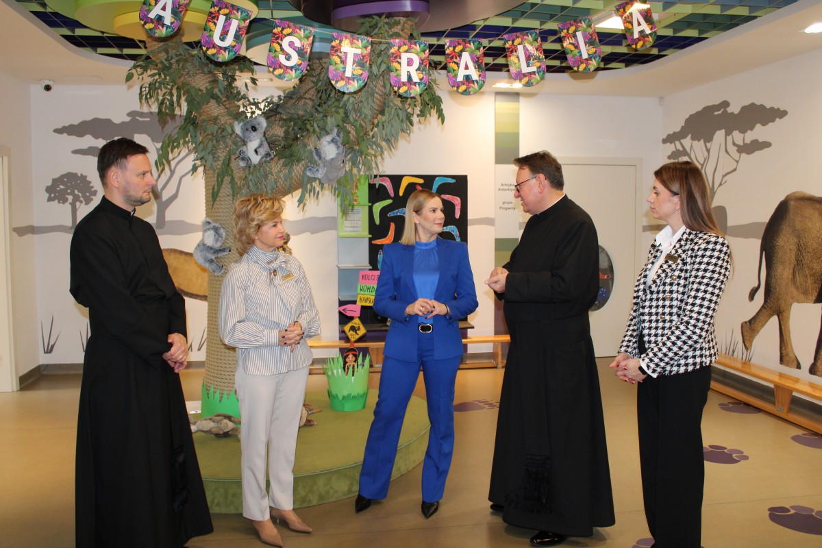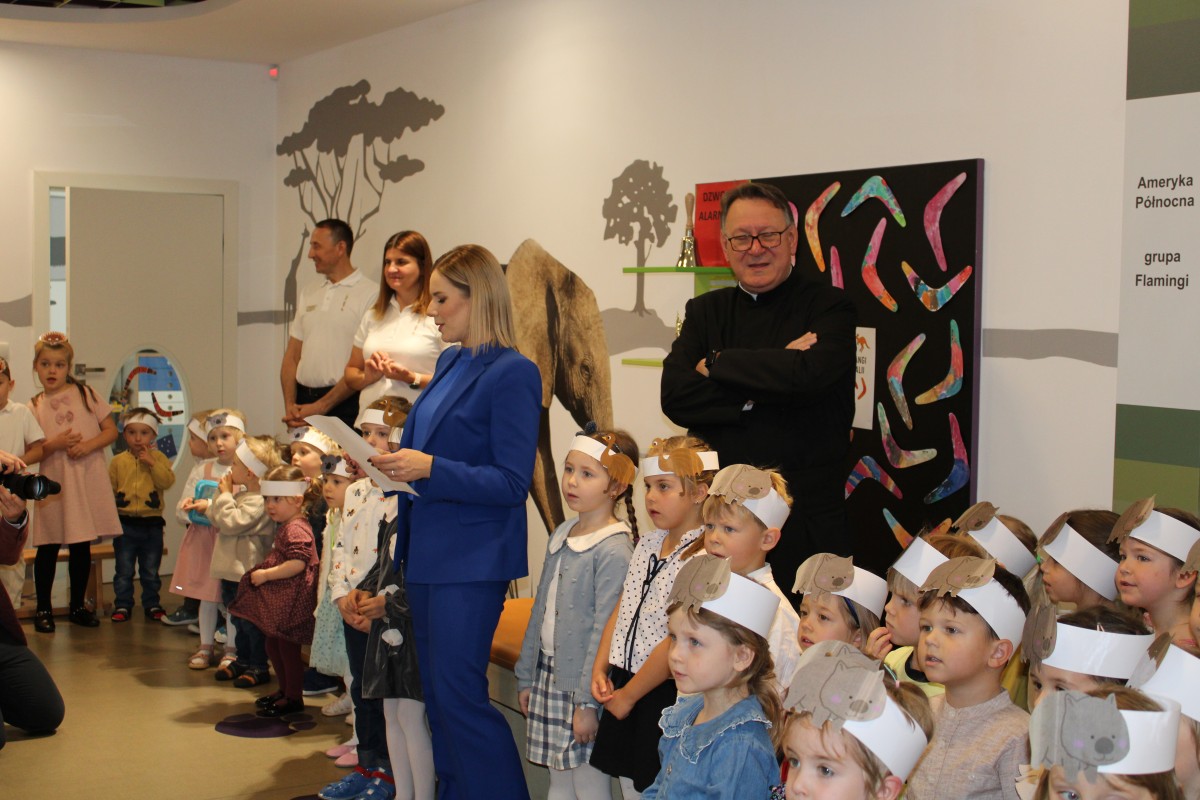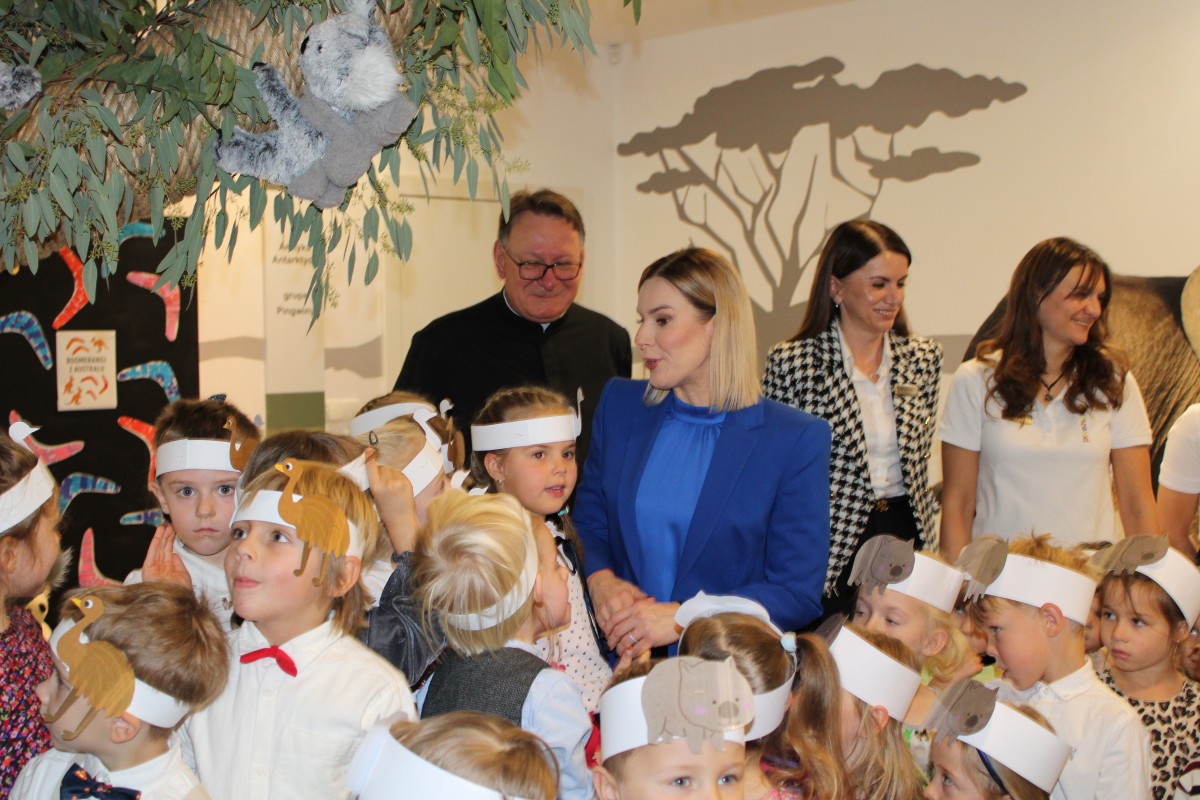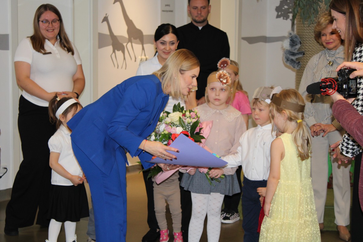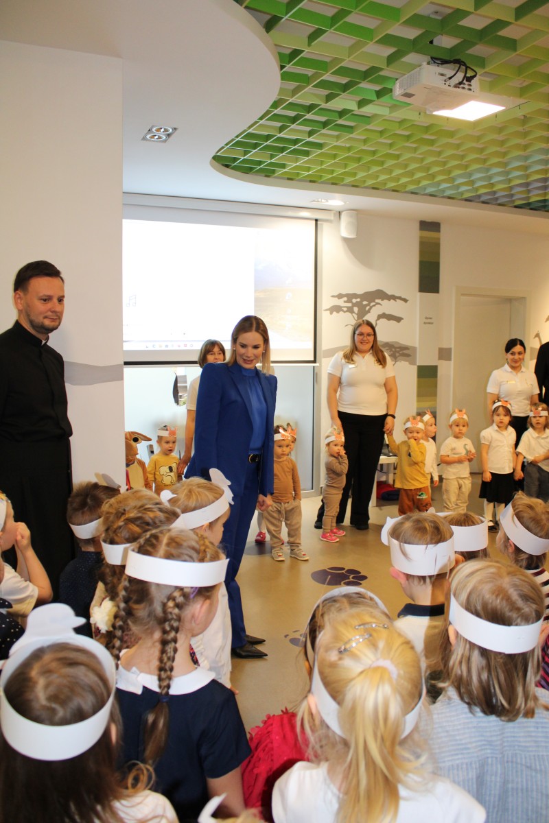 Wizyta Małżonki Prezydenta Polski, Pani Marty Nawrockiej w Pijarskim Przedszkolu w Warszawie, 13.10.2025 r.W ramach trwającego Jubileuszu Pijarskiego Przedszkola w Warszawie i przed dzień Święta Edukacji Narodowej odwiedziła nas Małżonka Prezydenta Polski - Pani Marta Nawrocka. Po przywitaniu przez Dyrekcję Przedszkola Panią Ewę, Panią Agnieszkę, o. Bogdana SP i o. Rafała SP, Rektora Kolegium Zakonu Pijarów Pierwsza Dama zwiedziła nasze przedszkole. Na początku zobaczyła salę poświęconą Państwu Halinie i Kazimierzowi Wąsowskich, naszym darczyńcom, następnie kuchnię a także spotkała się z jej personelem. Pani Dyrektor Ewa zapoznała naszego Gościa z historią Pijarskiego Przedszkola i pokazała galerię zdjęć z jego budowy. Dzieci z wychowawcami oraz pracownicy przedszkola były zebrane na holu pod Baobabem, gdzie Pani Dyrektor Ewa przywitała Małżonkę Prezydenta Polski, dzieci oraz pracowników przedszkola. Pani Wicedyrektor Agnieszka zaprosiła wszystkich do obejrzenia występu Grupy Kangury. W ramach programu „Mały Europejczyk zwiedza świat” dzieci z opiekunkami przedstawiły nam Australię i zwierzątka tam żyjące oraz zaśpiewały i zatańczyły piosenkę o kangurkach. Następnie dzieci z grupy Pingwiny zadawały małżonce Prezydenta Polski pytania. Po pytaniach przedszkole zaśpiewało piosenkę o św. Józefie Kalasancjuszu pt. „ W dalekiej Hiszpanii”. Następnie nasz Gość uczestniczył w warsztatach kulinarnych z grupą Pandy, gdzie wspólnie z dziećmi Pierwsza Dama robiła ciasteczka w kształcie kangurków. Na zakończenie delegacja dzieci podziękowała Małżonce Prezydenta Polski Pani Marcie Nawrockiej za wizytę wręczając własnoręcznie wykonaną laurkę oraz bukiet kwiatów.Wspólnota Pijarskiego Przedszkola w Warszawie bardzo dziękuje Pierwszej Damie za poświęcony czas, przemiłą wizytę oraz za prezenty przekazane wszystkim przedszkolakom i żłobkowiczom - piękne gry i książki.