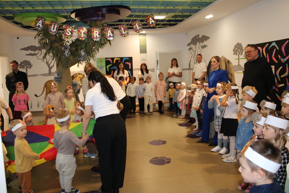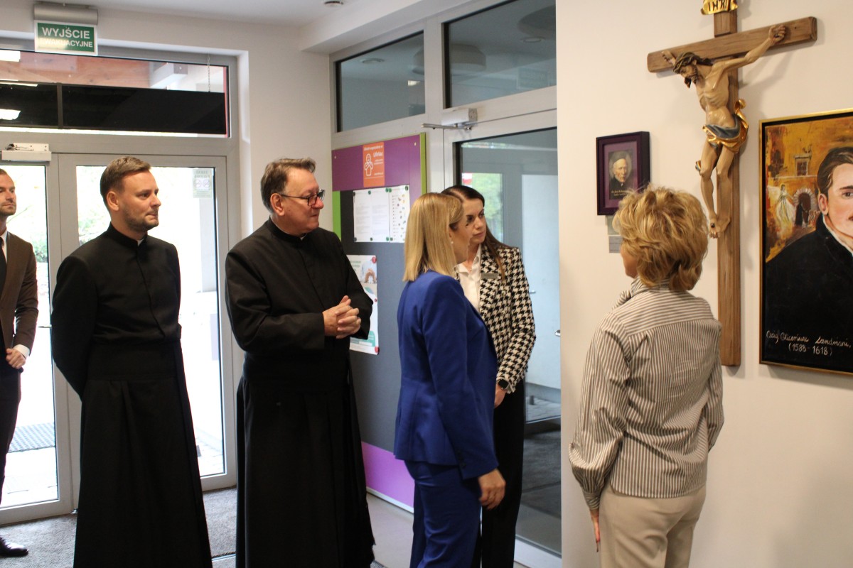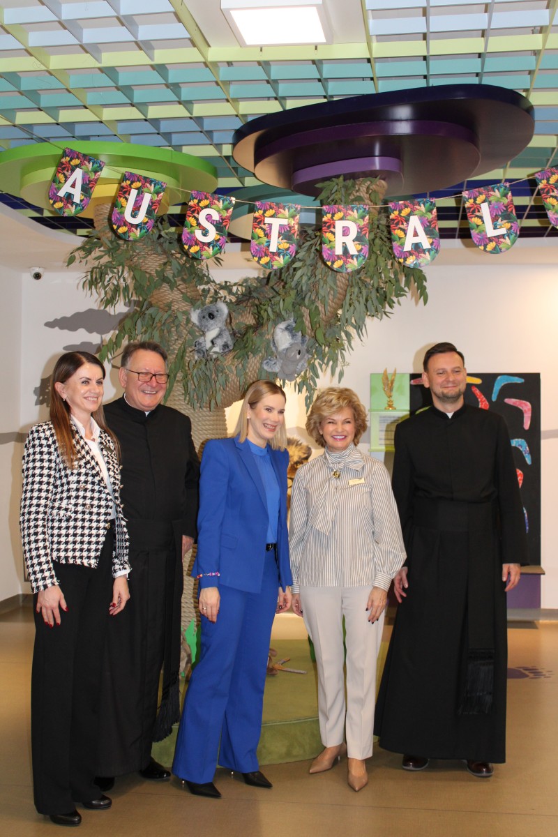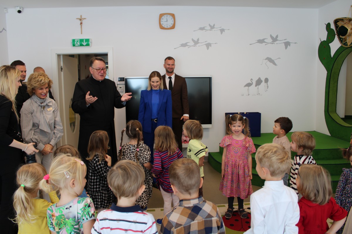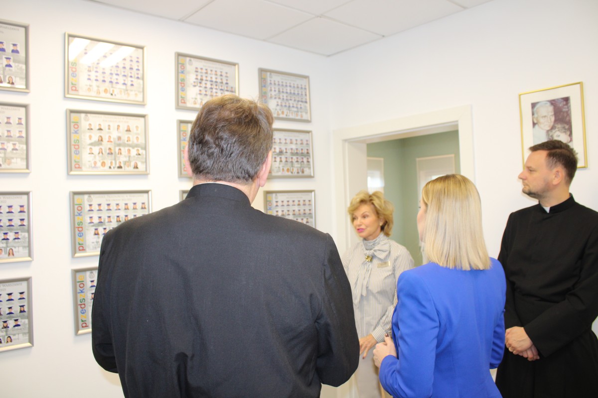 Wizyta Małżonki Prezydenta Polski, Pani Marty Nawrockiej w Pijarskim Przedszkolu w Warszawie, 13.10.2025 r.W ramach trwającego Jubileuszu Pijarskiego Przedszkola w Warszawie i przed dzień Święta Edukacji Narodowej odwiedziła nas Małżonka Prezydenta Polski - Pani Marta Nawrocka. Po przywitaniu przez Dyrekcję Przedszkola Panią Ewę, Panią Agnieszkę, o. Bogdana SP i o. Rafała SP, Rektora Kolegium Zakonu Pijarów Pierwsza Dama zwiedziła nasze przedszkole. Na początku zobaczyła salę poświęconą Państwu Halinie i Kazimierzowi Wąsowskich, naszym darczyńcom, następnie kuchnię a także spotkała się z jej personelem. Pani Dyrektor Ewa zapoznała naszego Gościa z historią Pijarskiego Przedszkola i pokazała galerię zdjęć z jego budowy. Dzieci z wychowawcami oraz pracownicy przedszkola były zebrane na holu pod Baobabem, gdzie Pani Dyrektor Ewa przywitała Małżonkę Prezydenta Polski, dzieci oraz pracowników przedszkola. Pani Wicedyrektor Agnieszka zaprosiła wszystkich do obejrzenia występu Grupy Kangury. W ramach programu „Mały Europejczyk zwiedza świat” dzieci z opiekunkami przedstawiły nam Australię i zwierzątka tam żyjące oraz zaśpiewały i zatańczyły piosenkę o kangurkach. Następnie dzieci z grupy Pingwiny zadawały małżonce Prezydenta Polski pytania. Po pytaniach przedszkole zaśpiewało piosenkę o św. Józefie Kalasancjuszu pt. „ W dalekiej Hiszpanii”. Następnie nasz Gość uczestniczył w warsztatach kulinarnych z grupą Pandy, gdzie wspólnie z dziećmi Pierwsza Dama robiła ciasteczka w kształcie kangurków. Na zakończenie delegacja dzieci podziękowała Małżonce Prezydenta Polski Pani Marcie Nawrockiej za wizytę wręczając własnoręcznie wykonaną laurkę oraz bukiet kwiatów.Wspólnota Pijarskiego Przedszkola w Warszawie bardzo dziękuje Pierwszej Damie za poświęcony czas, przemiłą wizytę oraz za prezenty przekazane wszystkim przedszkolakom i żłobkowiczom - piękne gry i książki.
