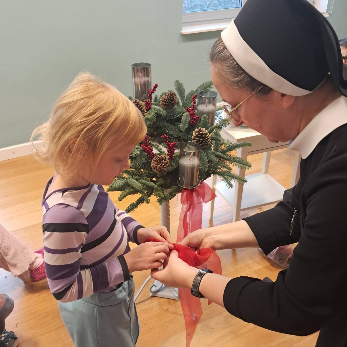 W dniu dzisiejszym dzieci z grupy Pingwiny na zajęciach z religii wykonały razem z Siostrą Anną piękny wieniec adwentowy, który towarzyszyć nam będzie w oczekiwaniu na Święta Bożego Narodzenia. Wieniec adwentowy z czterema świecami odnosi się do czterech aspektów adwentu: nadziei, pokoju, radości i miłości. Każda świeca reprezentuje jedną z tych wartości, a ich kolejne zapalanie symbolizuje przybliżanie się do świąt Bożego Narodzenia.