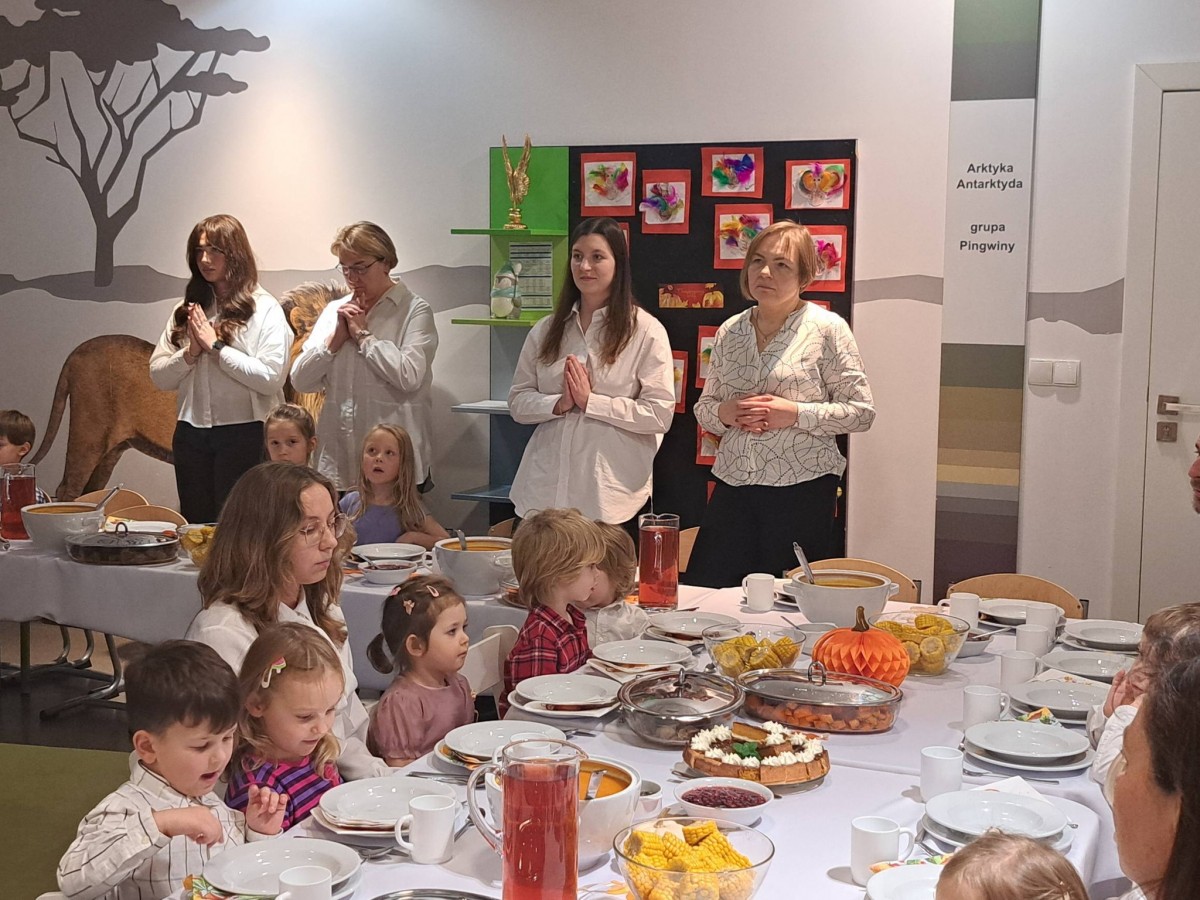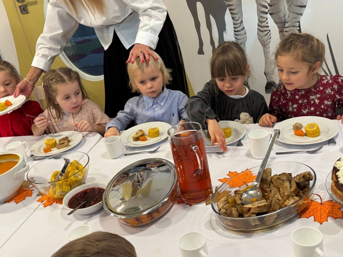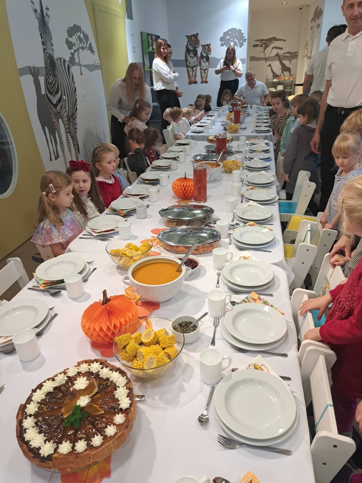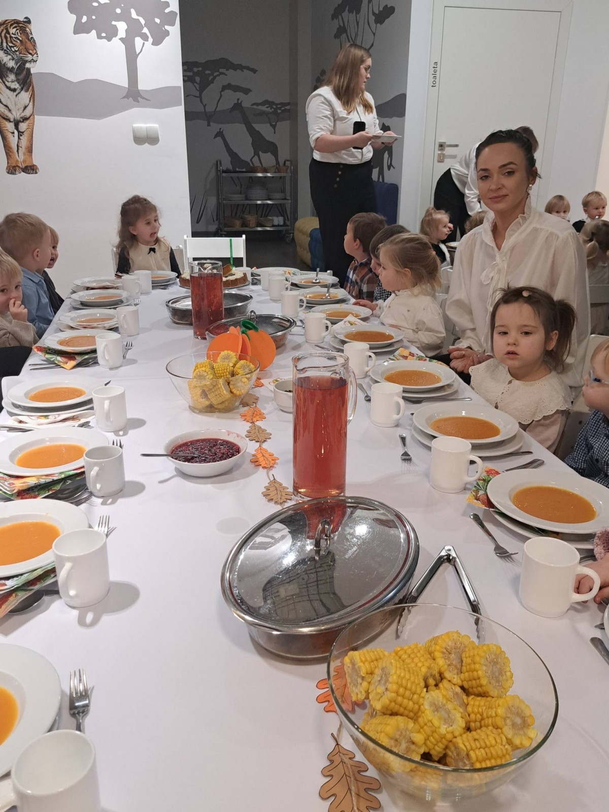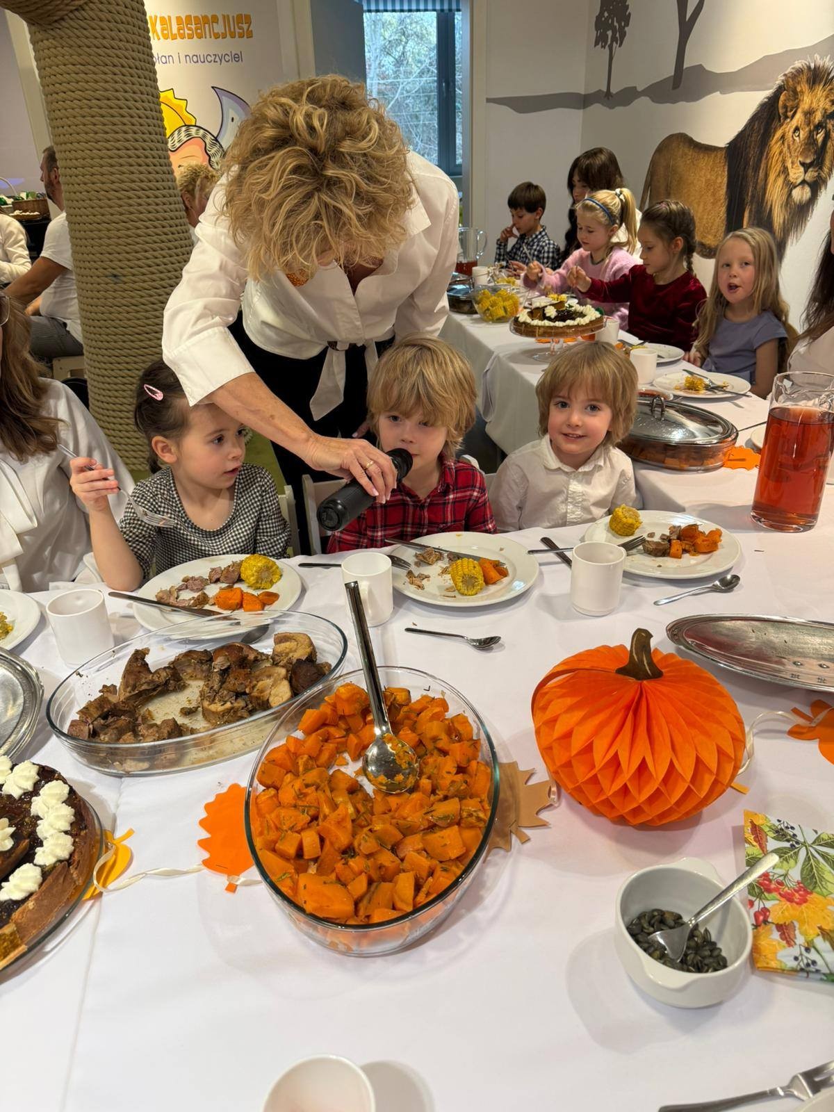 Dzisiaj nasze przedszkole wypełniło się wyjątkową atmosferą Święta Dziękczynienia. To piękna tradycja, która sięga 1621 roku, kiedy osadnicy z Plymouth, wraz z rdzenną ludnością Ameryki, po raz pierwszy zasiedli razem do stołu, by w jedności i wdzięczności podziękować Bogu za życie, plony i wzajemną życzliwość. Ta historia wciąż przypomina, jak ważne jest zatrzymanie się i dostrzeżenie dobra, które otrzymujemy każdego dnia od Pana Boga.Właśnie w tym duchu usiedliśmy dziś wszyscy do wspólnego, przedszkolnego stołu.A nasze dzieci były absolutnie cudowne. Podczas posiłku dziękowały za to, co dla nich najważniejsze: za rodzinę, rodziców, rodzeństwo, za swoje panie, za rytmikę, za angielski i hiszpański za zabawki, za przedszkole i za pokój na świecie. Ich proste, szczere słowa wzruszały i przypominały, jak wiele piękna kryje się w dziecięcej wdzięczności.Na naszych stołach nie zabrakło tradycyjnych potraw: pysznego indyka, smakowitych dodatków i obowiązkowego ciasta dyniowego.Z serca dziękujemy naszym kucharzom za pracę, której owocem był ten niezwykły posiłek. To był dzień pełen ciepła, wdzięczności i bycia razem.Dzień, który na długo zostanie w naszej pamięci.