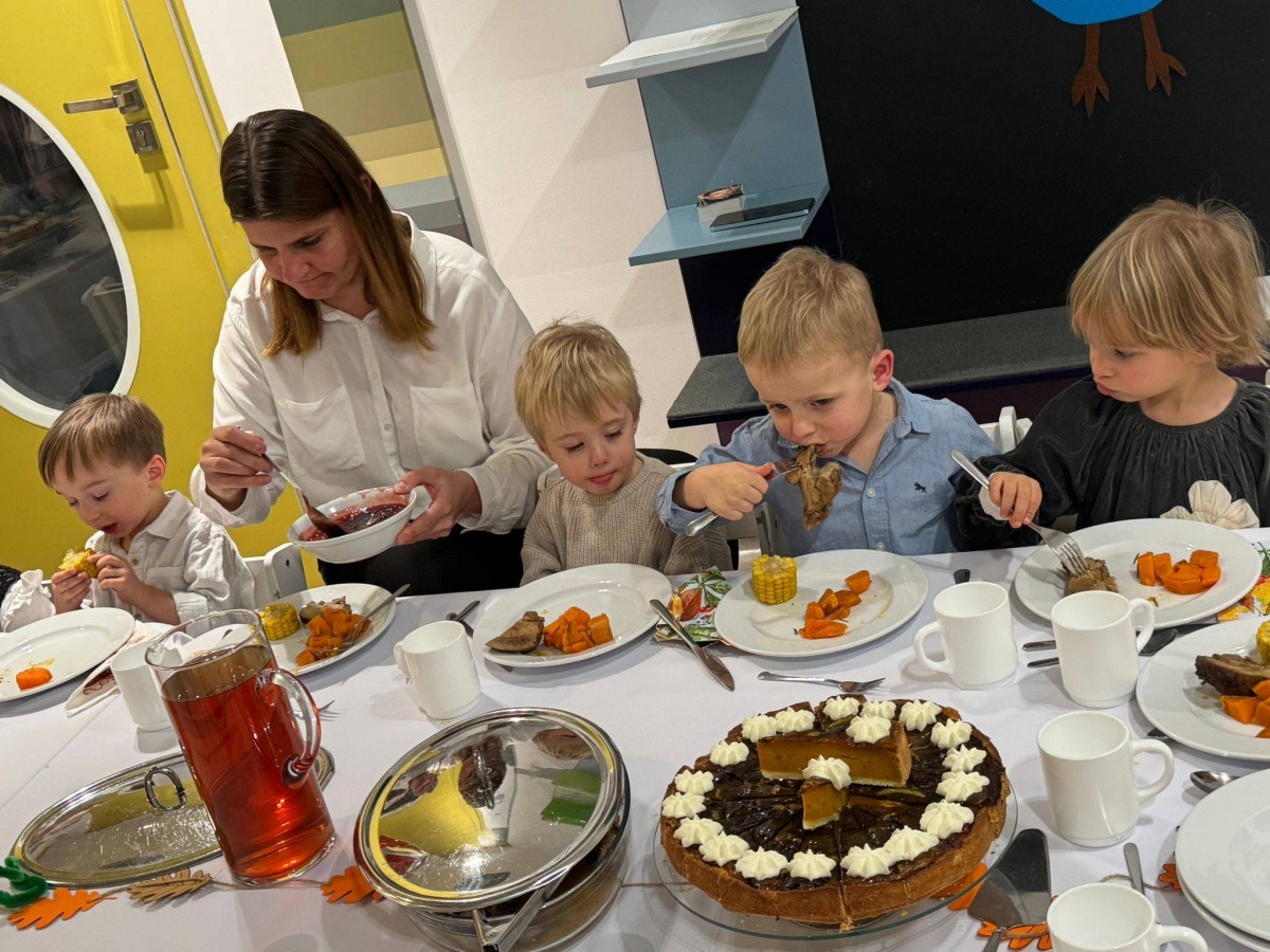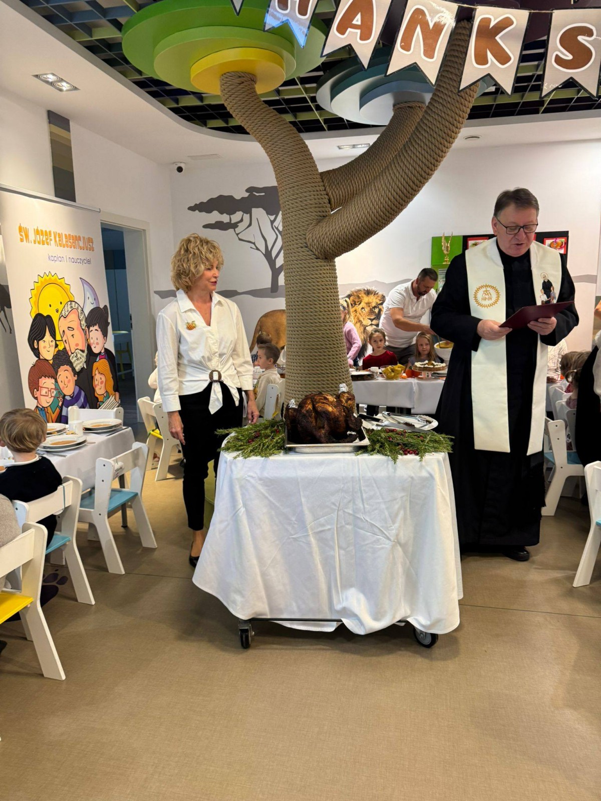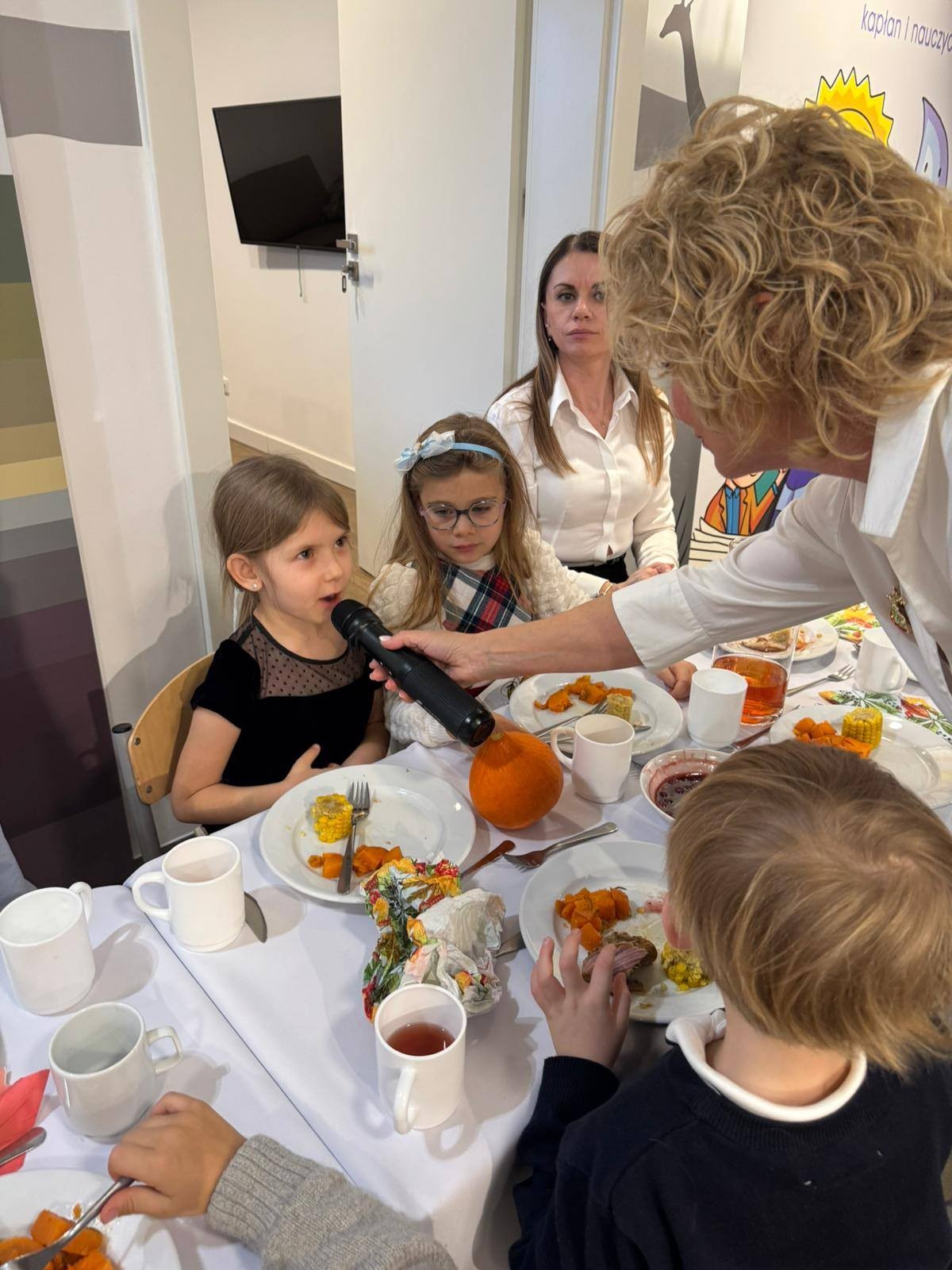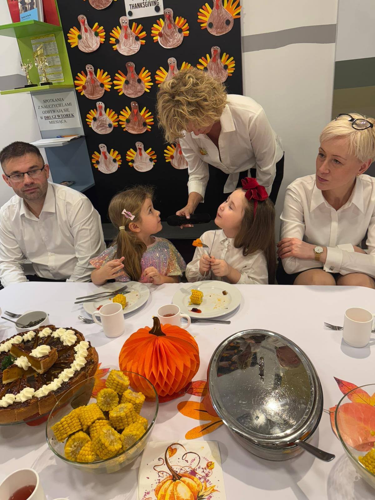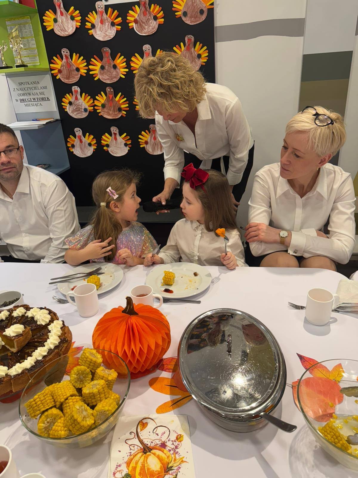 Dzisiaj nasze przedszkole wypełniło się wyjątkową atmosferą Święta Dziękczynienia. To piękna tradycja, która sięga 1621 roku, kiedy osadnicy z Plymouth, wraz z rdzenną ludnością Ameryki, po raz pierwszy zasiedli razem do stołu, by w jedności i wdzięczności podziękować Bogu za życie, plony i wzajemną życzliwość. Ta historia wciąż przypomina, jak ważne jest zatrzymanie się i dostrzeżenie dobra, które otrzymujemy każdego dnia od Pana Boga.Właśnie w tym duchu usiedliśmy dziś wszyscy do wspólnego, przedszkolnego stołu.A nasze dzieci były absolutnie cudowne. Podczas posiłku dziękowały za to, co dla nich najważniejsze: za rodzinę, rodziców, rodzeństwo, za swoje panie, za rytmikę, za angielski i hiszpański za zabawki, za przedszkole i za pokój na świecie. Ich proste, szczere słowa wzruszały i przypominały, jak wiele piękna kryje się w dziecięcej wdzięczności.Na naszych stołach nie zabrakło tradycyjnych potraw: pysznego indyka, smakowitych dodatków i obowiązkowego ciasta dyniowego.Z serca dziękujemy naszym kucharzom za pracę, której owocem był ten niezwykły posiłek. To był dzień pełen ciepła, wdzięczności i bycia razem.Dzień, który na długo zostanie w naszej pamięci.