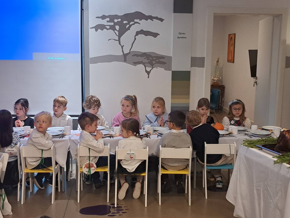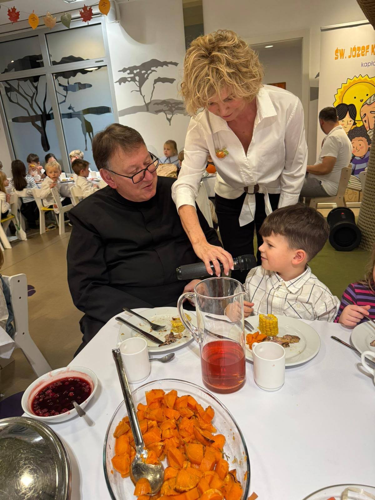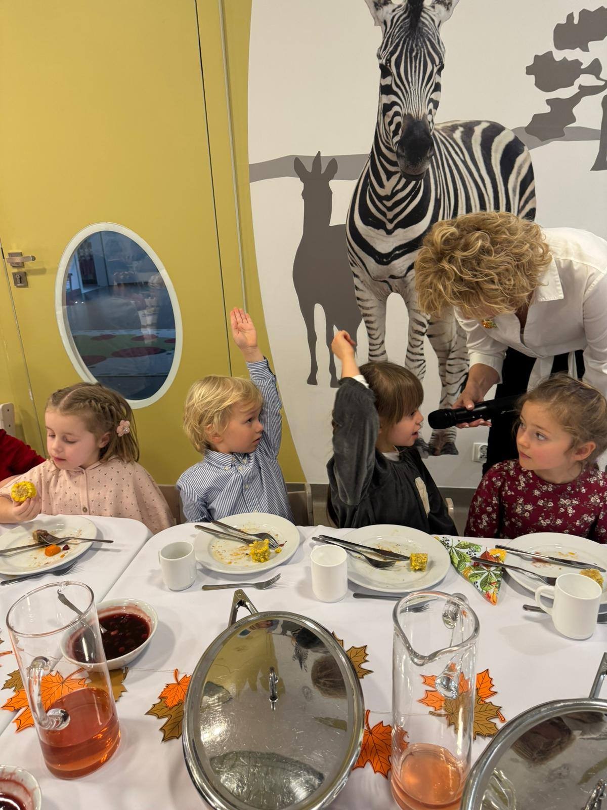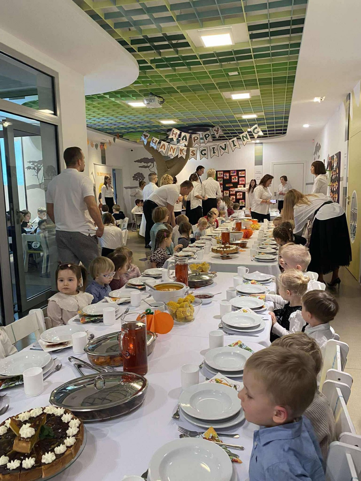 Dzisiaj nasze przedszkole wypełniło się wyjątkową atmosferą Święta Dziękczynienia. To piękna tradycja, która sięga 1621 roku, kiedy osadnicy z Plymouth, wraz z rdzenną ludnością Ameryki, po raz pierwszy zasiedli razem do stołu, by w jedności i wdzięczności podziękować Bogu za życie, plony i wzajemną życzliwość. Ta historia wciąż przypomina, jak ważne jest zatrzymanie się i dostrzeżenie dobra, które otrzymujemy każdego dnia od Pana Boga.Właśnie w tym duchu usiedliśmy dziś wszyscy do wspólnego, przedszkolnego stołu.A nasze dzieci były absolutnie cudowne. Podczas posiłku dziękowały za to, co dla nich najważniejsze: za rodzinę, rodziców, rodzeństwo, za swoje panie, za rytmikę, za angielski i hiszpański za zabawki, za przedszkole i za pokój na świecie. Ich proste, szczere słowa wzruszały i przypominały, jak wiele piękna kryje się w dziecięcej wdzięczności.Na naszych stołach nie zabrakło tradycyjnych potraw: pysznego indyka, smakowitych dodatków i obowiązkowego ciasta dyniowego.Z serca dziękujemy naszym kucharzom za pracę, której owocem był ten niezwykły posiłek. To był dzień pełen ciepła, wdzięczności i bycia razem.Dzień, który na długo zostanie w naszej pamięci.