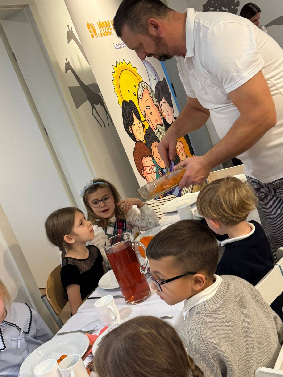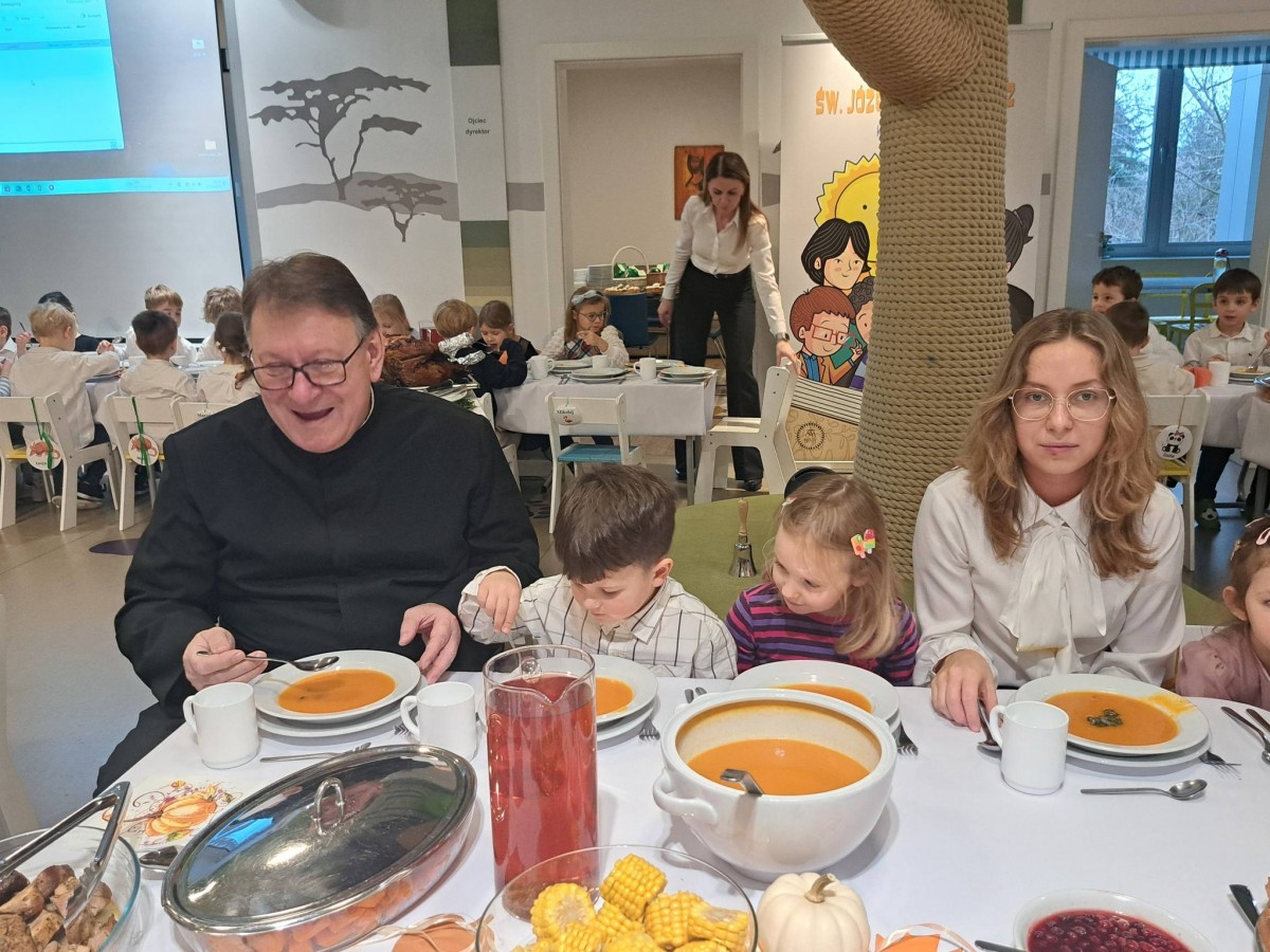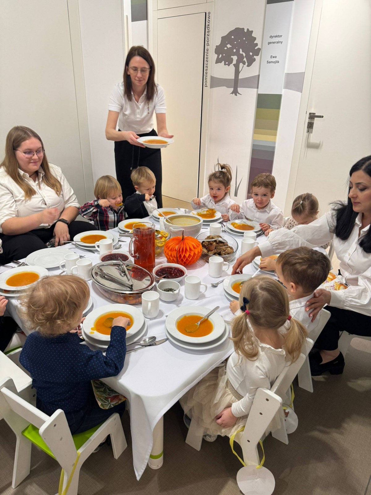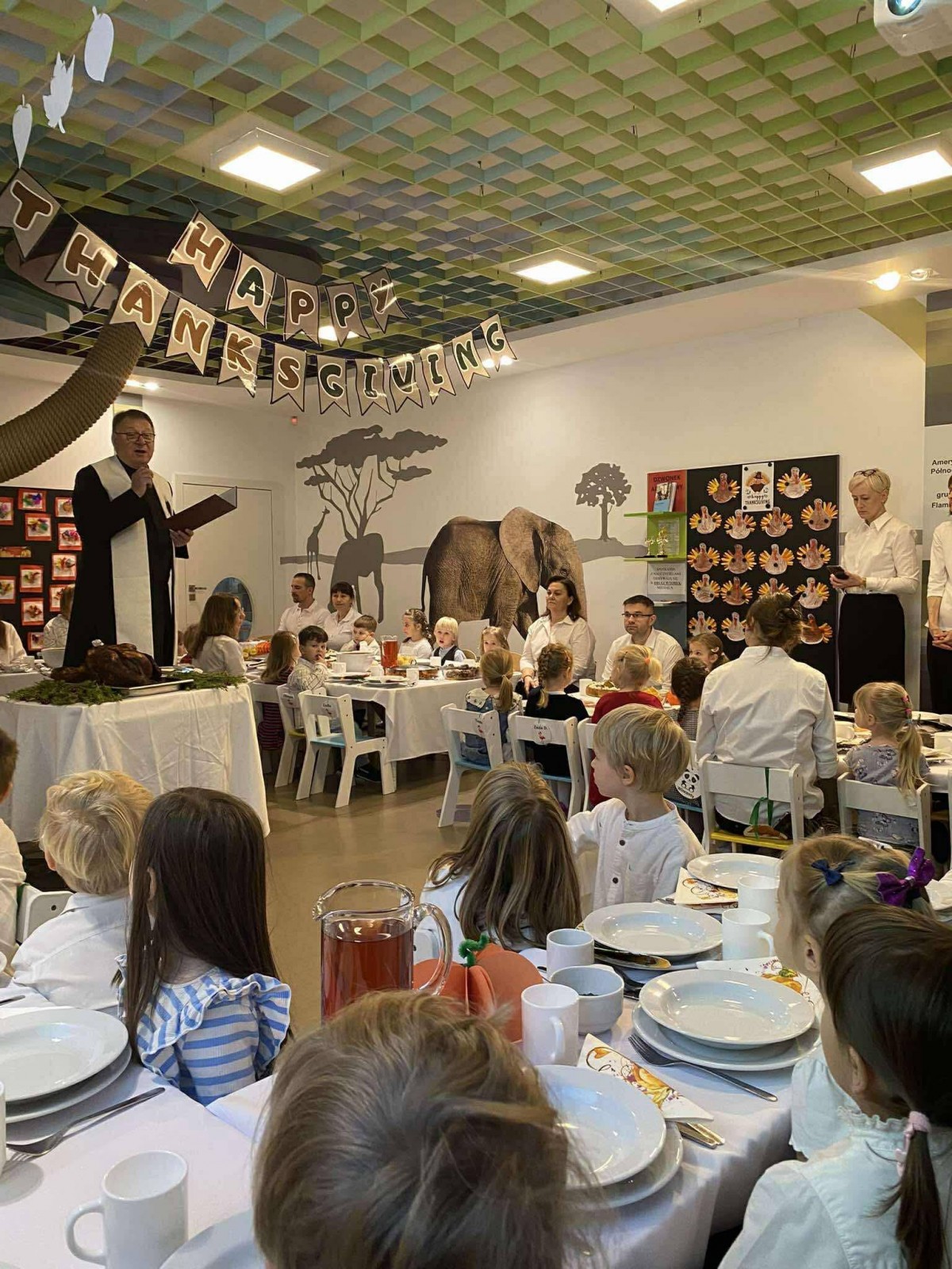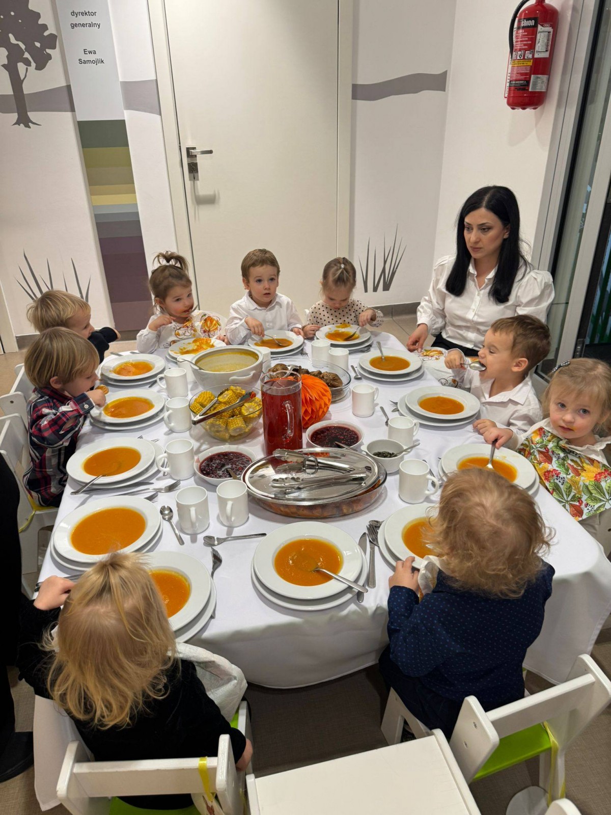 Dzisiaj nasze przedszkole wypełniło się wyjątkową atmosferą Święta Dziękczynienia. To piękna tradycja, która sięga 1621 roku, kiedy osadnicy z Plymouth, wraz z rdzenną ludnością Ameryki, po raz pierwszy zasiedli razem do stołu, by w jedności i wdzięczności podziękować Bogu za życie, plony i wzajemną życzliwość. Ta historia wciąż przypomina, jak ważne jest zatrzymanie się i dostrzeżenie dobra, które otrzymujemy każdego dnia od Pana Boga.Właśnie w tym duchu usiedliśmy dziś wszyscy do wspólnego, przedszkolnego stołu.A nasze dzieci były absolutnie cudowne. Podczas posiłku dziękowały za to, co dla nich najważniejsze: za rodzinę, rodziców, rodzeństwo, za swoje panie, za rytmikę, za angielski i hiszpański za zabawki, za przedszkole i za pokój na świecie. Ich proste, szczere słowa wzruszały i przypominały, jak wiele piękna kryje się w dziecięcej wdzięczności.Na naszych stołach nie zabrakło tradycyjnych potraw: pysznego indyka, smakowitych dodatków i obowiązkowego ciasta dyniowego.Z serca dziękujemy naszym kucharzom za pracę, której owocem był ten niezwykły posiłek. To był dzień pełen ciepła, wdzięczności i bycia razem.Dzień, który na długo zostanie w naszej pamięci.