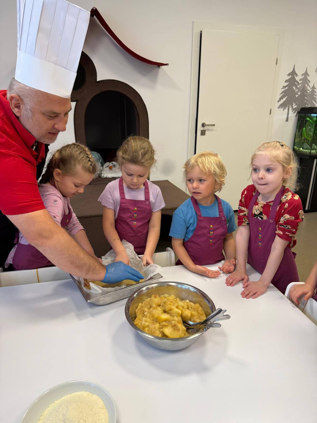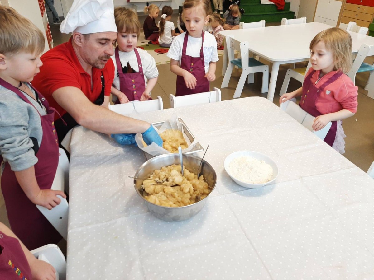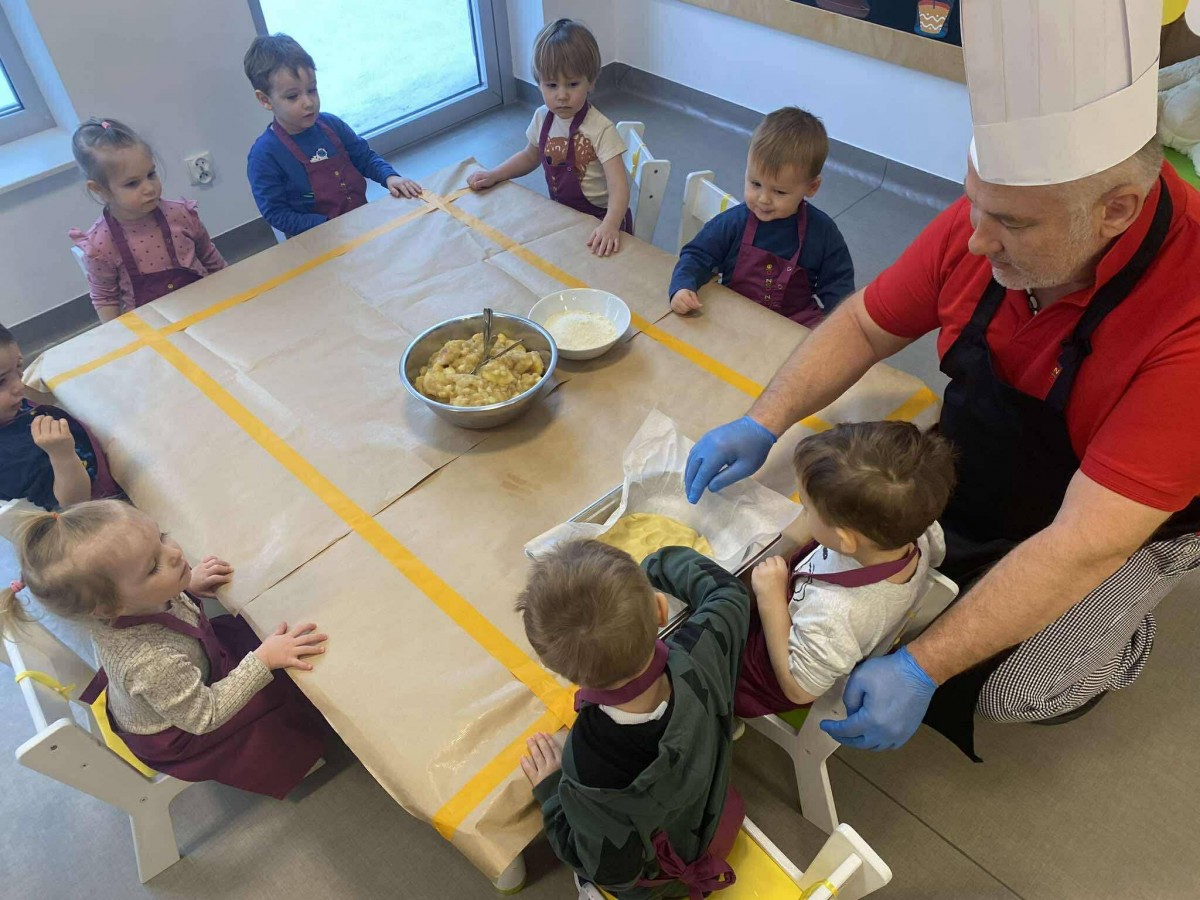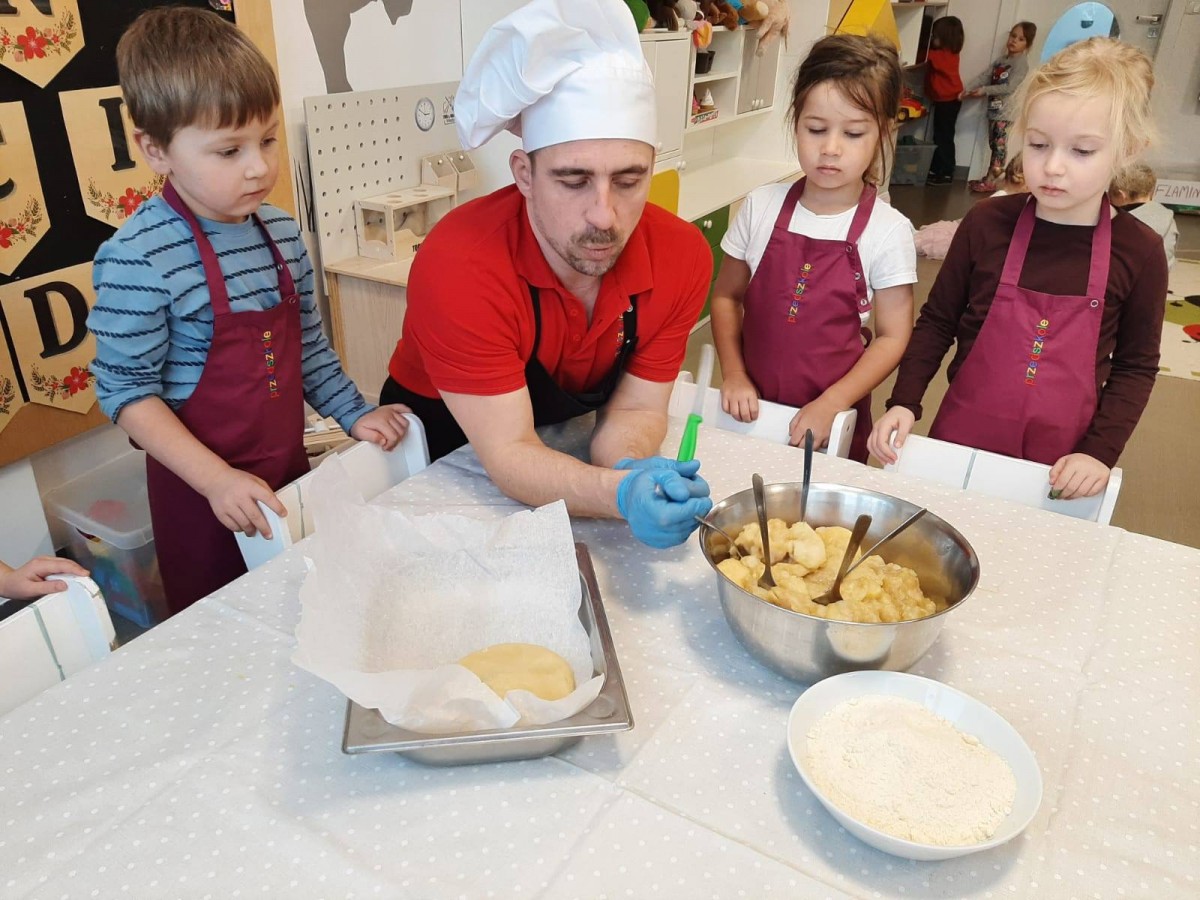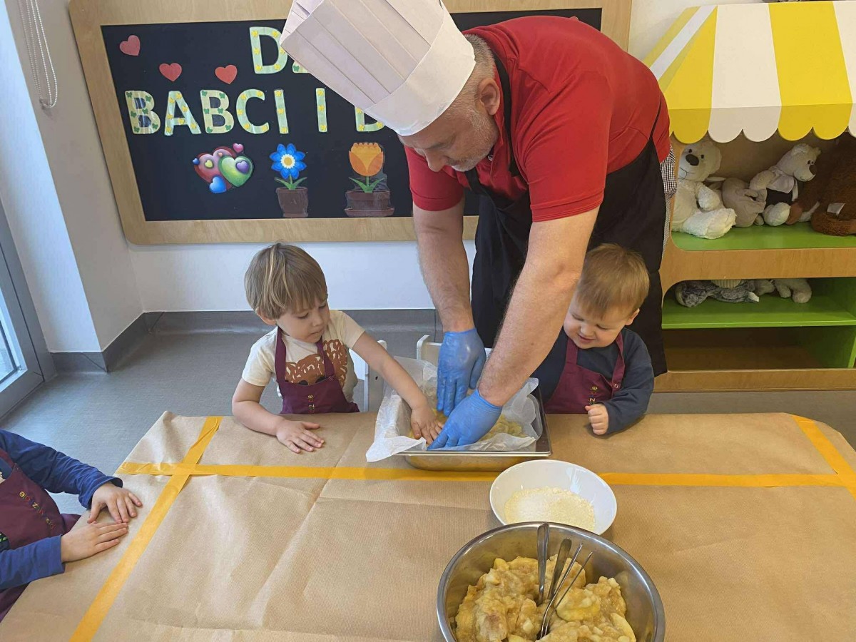 Nasze przedszkolaki wspólnie z kucharzami przygotowali na Dzień Babci i Dziadka pyszne szarlotki.