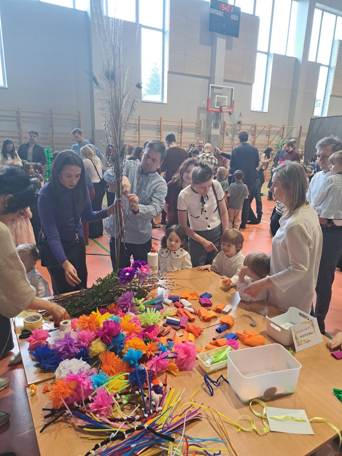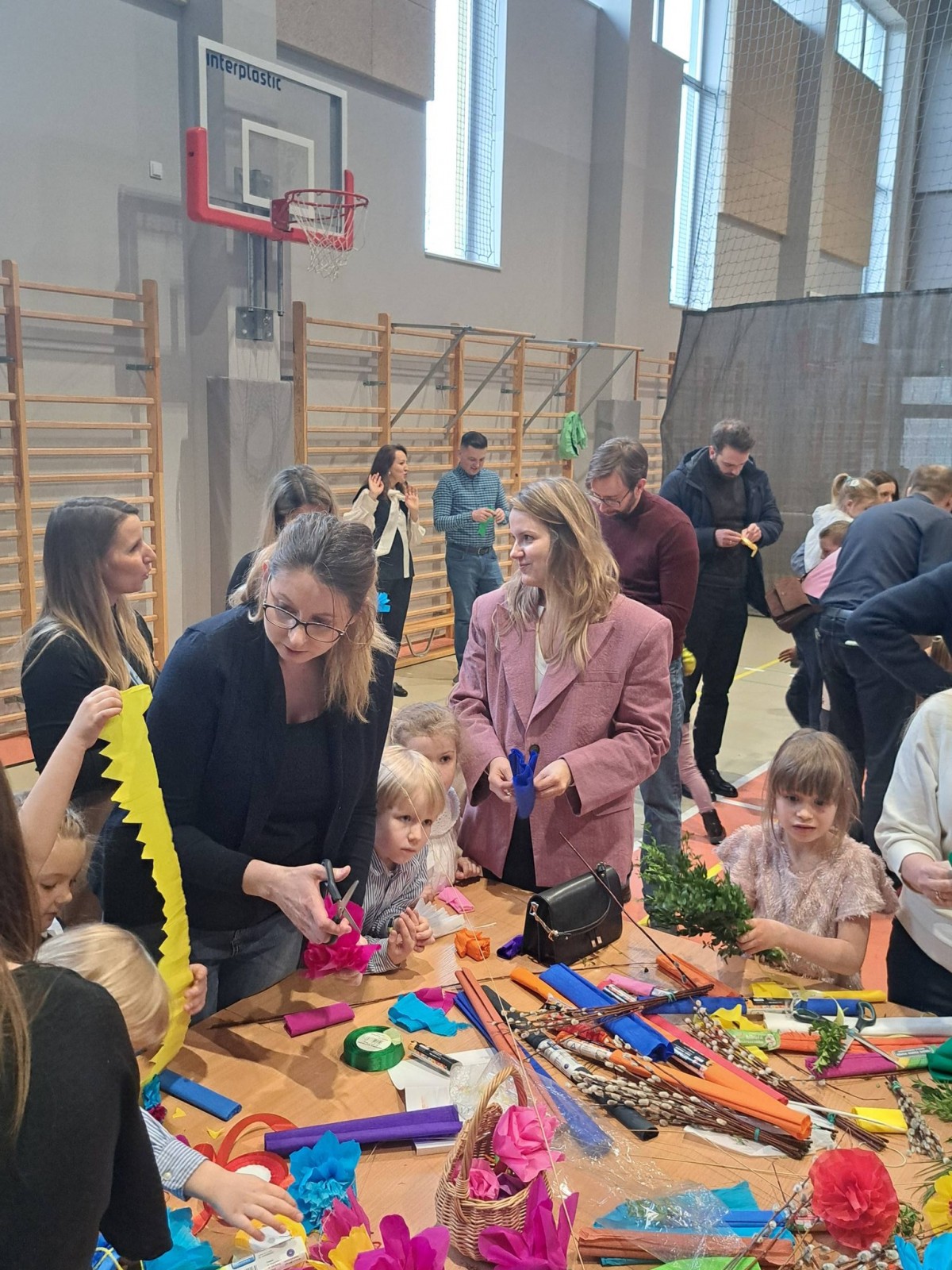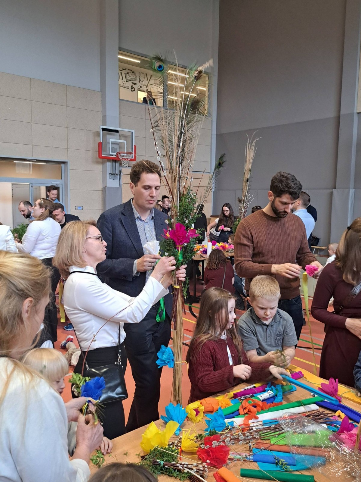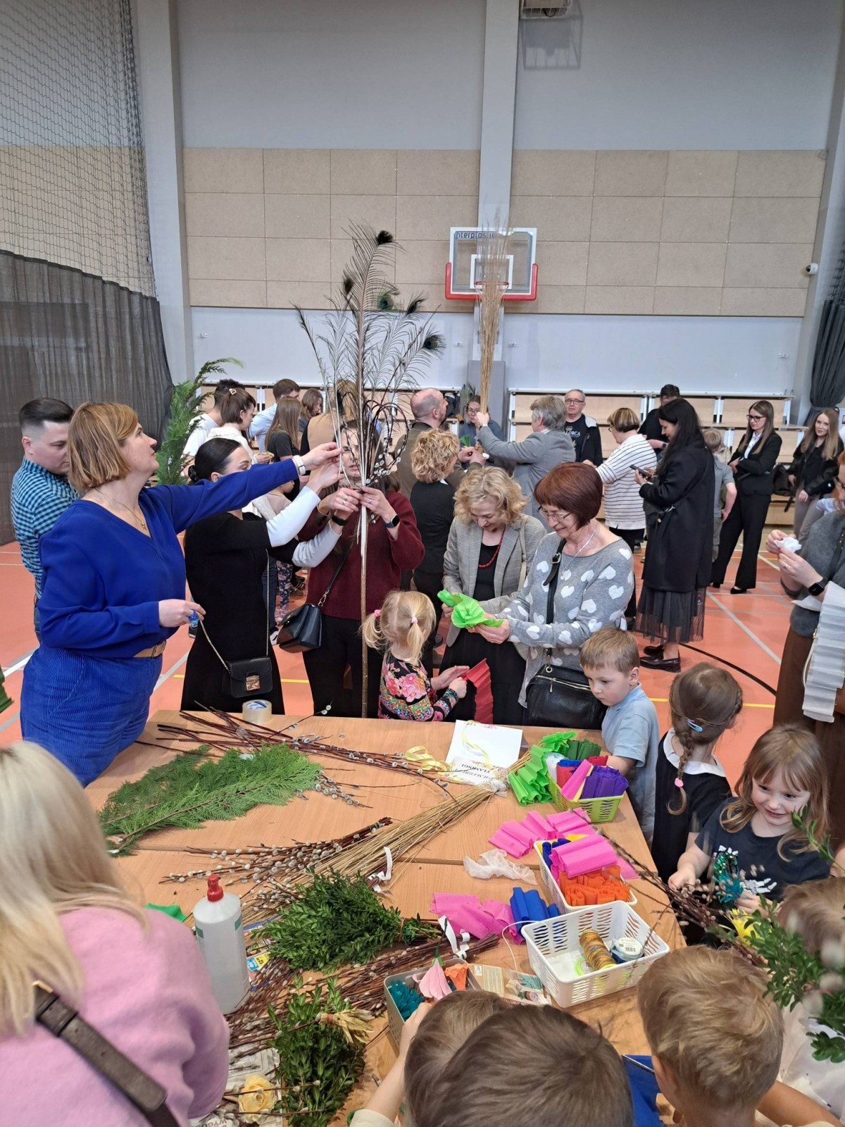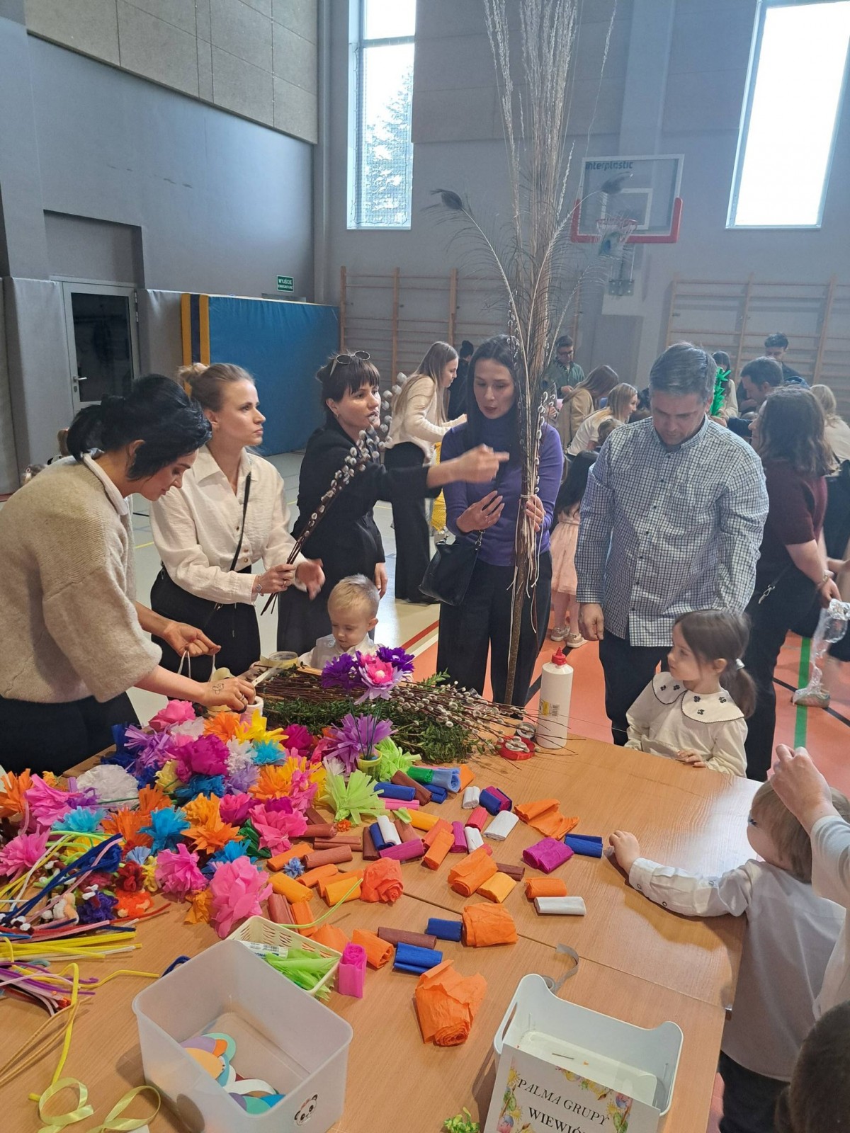 Wczoraj po południu gościła nas Pijarska Szkoła Podstawowa. O godzinie 15.00 całe Pijarskie Przedszkole z grupą żłobkową, Rodzice i Pracownicy Przedszkola zgromadziliśmy się w sali sportowej, aby podtrzymać naszą przedszkolną tradycję i przed Niedzielą Palmową wykonać wspólnie palmy. Po przywitaniu wszystkich przez Panią Dyrektor Ewę, grupy zabrały się do wykonania jednej wspólnej palmy. Powstałe palmy są piękne, kolorowe, wiosenne i bardzo radosne. Czujemy już Święta Wielkanocne. W najbliższą niedzielę Palmową o godzinie 16.00, każda grupa ze swoją Palmą w procesji wejdzie do kościoła Sanktuarium na Siekierkach. Niedzielą Palmową rozpoczniemy Wielki Tydzień a w nim Triduum Paschalne.Po wykonaniu palm w drugiej części sali czekał na wszystkich wielkanocny poczęstunek przygotowany przez naszych kucharzy. Po modlitwie i błogosławieństwie pokarmów przez Ojca Bogdana wspólnie świętowaliśmy. Dziękujemy wszystkim za włączenie się i pomoc w przygotowaniu tego świątecznego spotkania, które miało wyjątkowy charakter i pokazało, jak wiele radości może przynieść wspólne tworzenie i pielęgnowanie tradycji wielkanocnych.