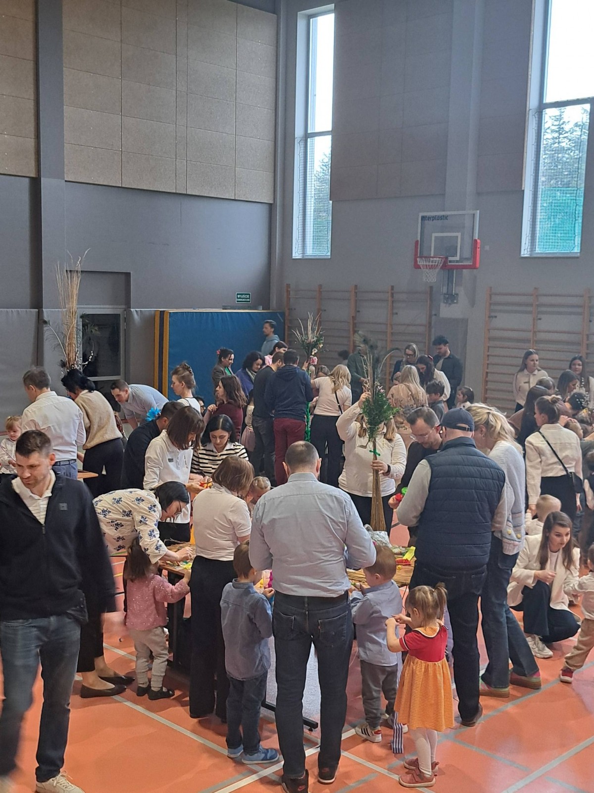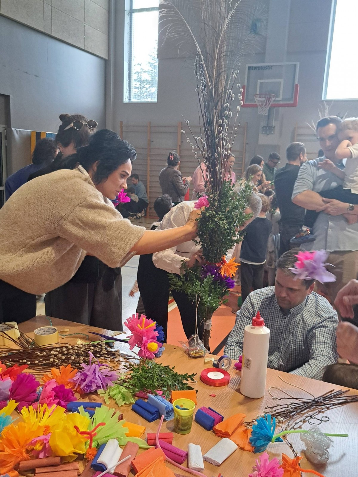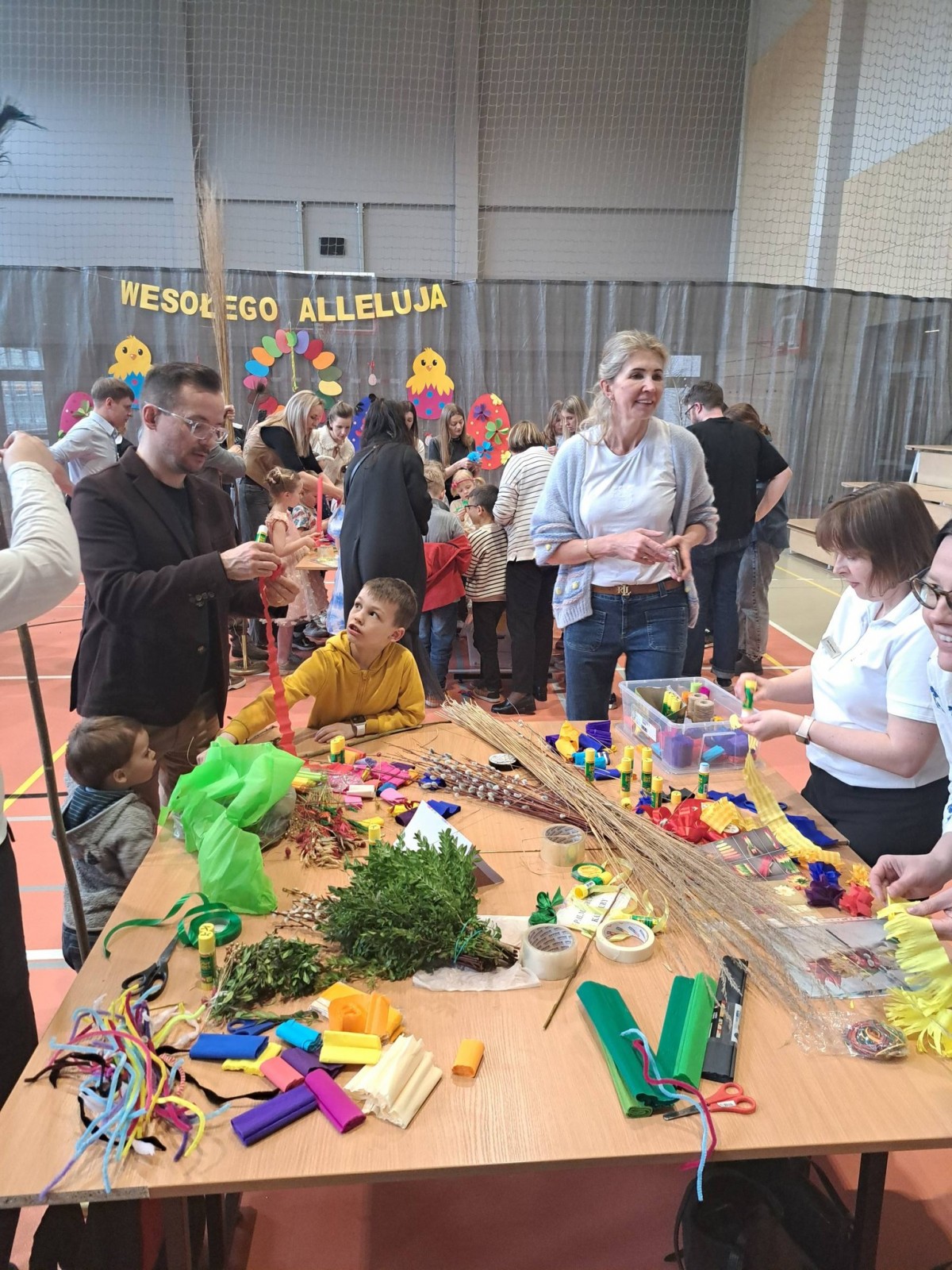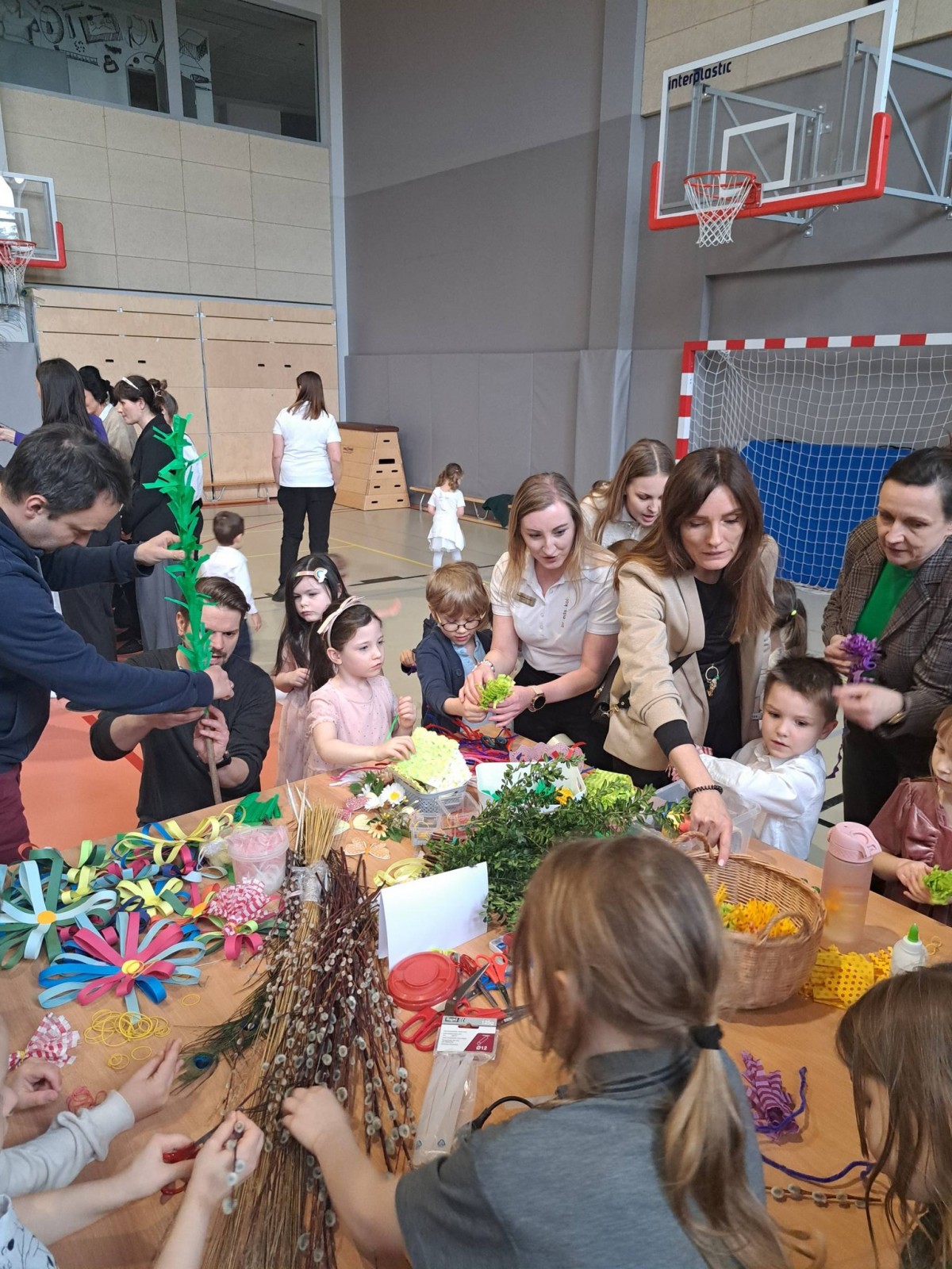 Wczoraj po południu gościła nas Pijarska Szkoła Podstawowa. O godzinie 15.00 całe Pijarskie Przedszkole z grupą żłobkową, Rodzice i Pracownicy Przedszkola zgromadziliśmy się w sali sportowej, aby podtrzymać naszą przedszkolną tradycję i przed Niedzielą Palmową wykonać wspólnie palmy. Po przywitaniu wszystkich przez Panią Dyrektor Ewę, grupy zabrały się do wykonania jednej wspólnej palmy. Powstałe palmy są piękne, kolorowe, wiosenne i bardzo radosne. Czujemy już Święta Wielkanocne. W najbliższą niedzielę Palmową o godzinie 16.00, każda grupa ze swoją Palmą w procesji wejdzie do kościoła Sanktuarium na Siekierkach. Niedzielą Palmową rozpoczniemy Wielki Tydzień a w nim Triduum Paschalne.Po wykonaniu palm w drugiej części sali czekał na wszystkich wielkanocny poczęstunek przygotowany przez naszych kucharzy. Po modlitwie i błogosławieństwie pokarmów przez Ojca Bogdana wspólnie świętowaliśmy. Dziękujemy wszystkim za włączenie się i pomoc w przygotowaniu tego świątecznego spotkania, które miało wyjątkowy charakter i pokazało, jak wiele radości może przynieść wspólne tworzenie i pielęgnowanie tradycji wielkanocnych.