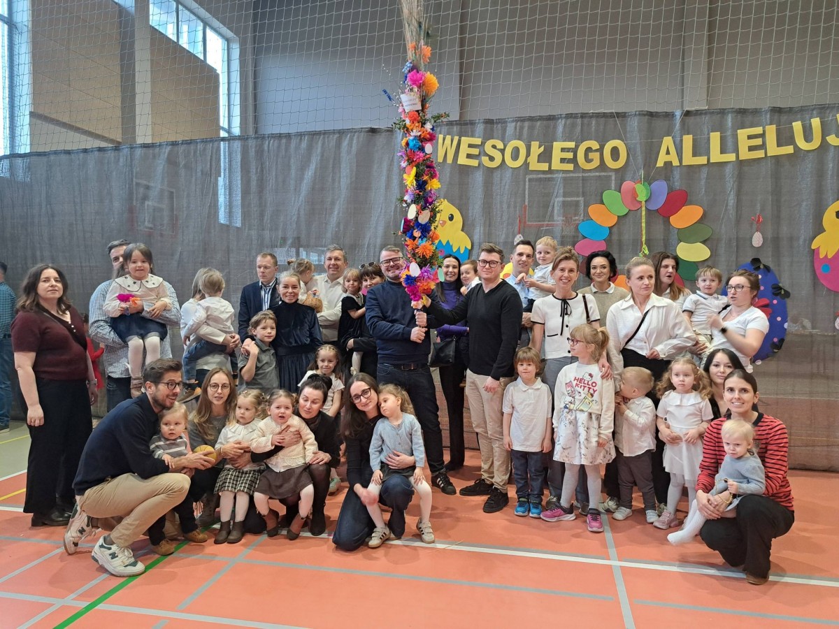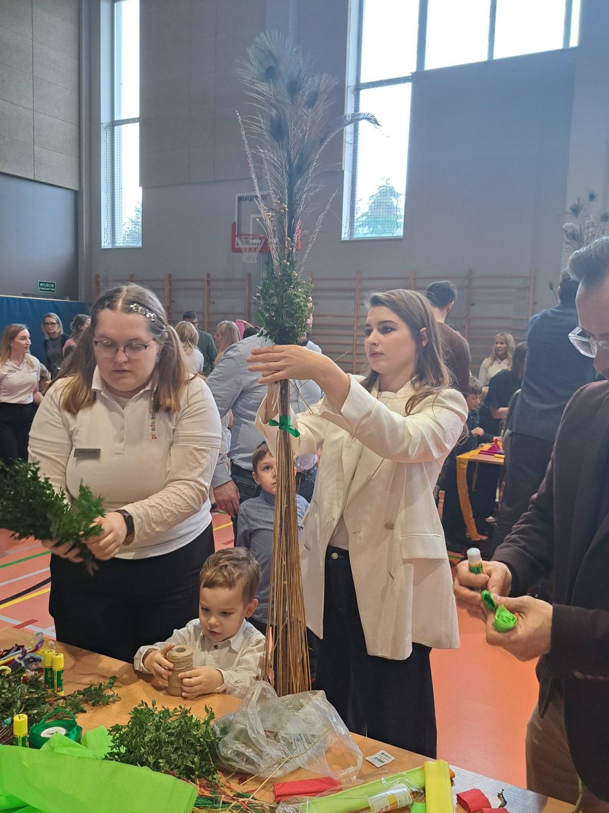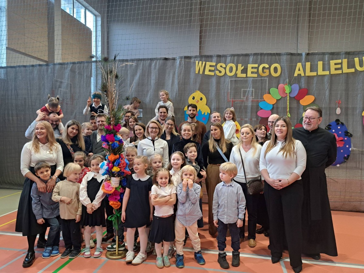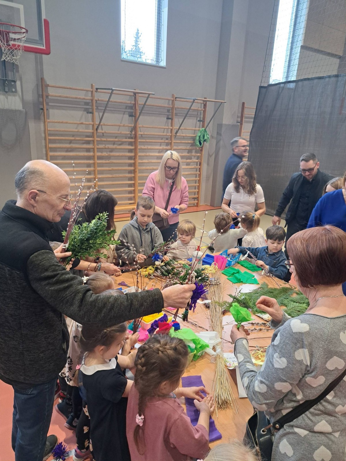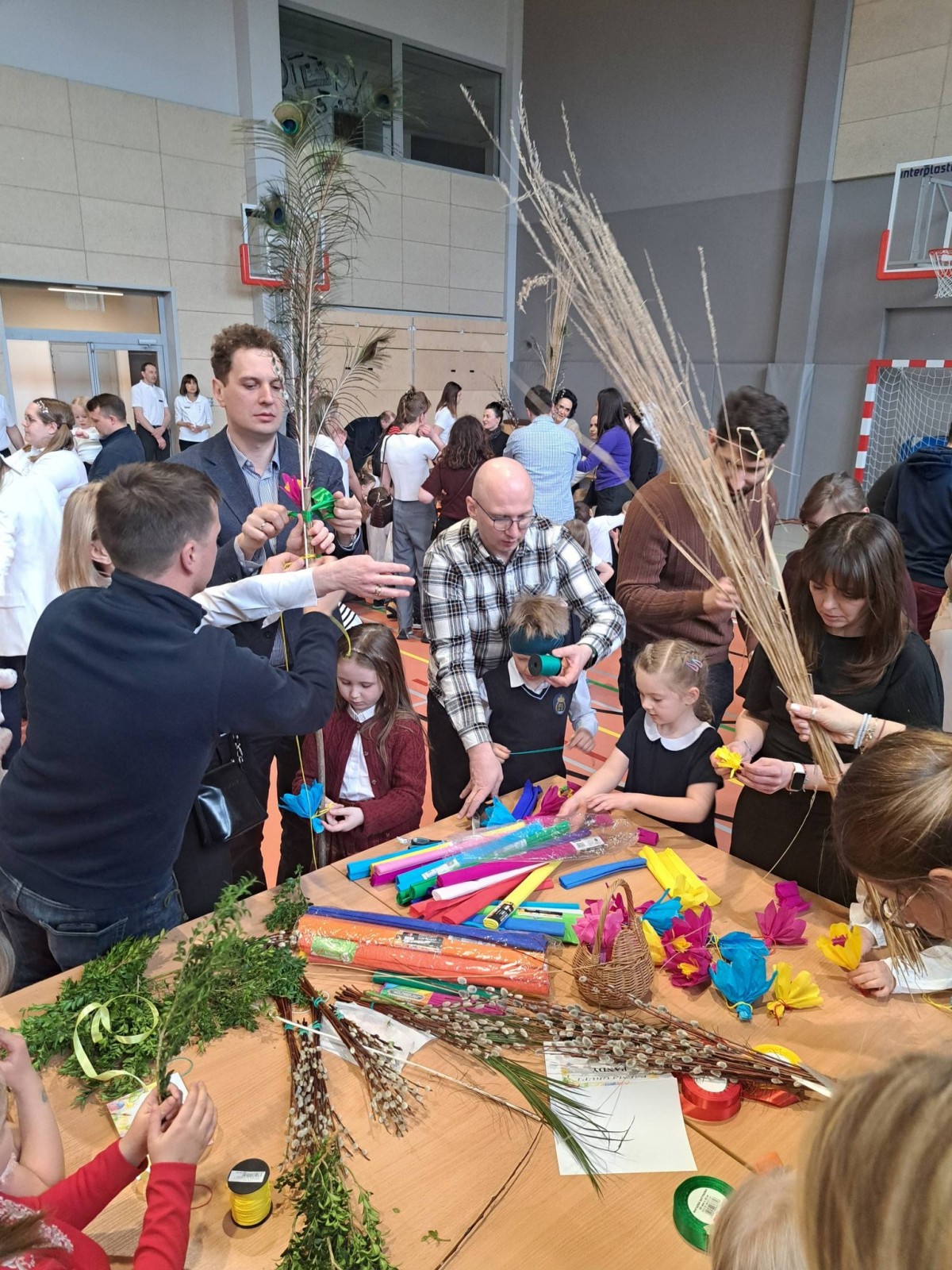 Wczoraj po południu gościła nas Pijarska Szkoła Podstawowa. O godzinie 15.00 całe Pijarskie Przedszkole z grupą żłobkową, Rodzice i Pracownicy Przedszkola zgromadziliśmy się w sali sportowej, aby podtrzymać naszą przedszkolną tradycję i przed Niedzielą Palmową wykonać wspólnie palmy. Po przywitaniu wszystkich przez Panią Dyrektor Ewę, grupy zabrały się do wykonania jednej wspólnej palmy. Powstałe palmy są piękne, kolorowe, wiosenne i bardzo radosne. Czujemy już Święta Wielkanocne. W najbliższą niedzielę Palmową o godzinie 16.00, każda grupa ze swoją Palmą w procesji wejdzie do kościoła Sanktuarium na Siekierkach. Niedzielą Palmową rozpoczniemy Wielki Tydzień a w nim Triduum Paschalne.Po wykonaniu palm w drugiej części sali czekał na wszystkich wielkanocny poczęstunek przygotowany przez naszych kucharzy. Po modlitwie i błogosławieństwie pokarmów przez Ojca Bogdana wspólnie świętowaliśmy. Dziękujemy wszystkim za włączenie się i pomoc w przygotowaniu tego świątecznego spotkania, które miało wyjątkowy charakter i pokazało, jak wiele radości może przynieść wspólne tworzenie i pielęgnowanie tradycji wielkanocnych.