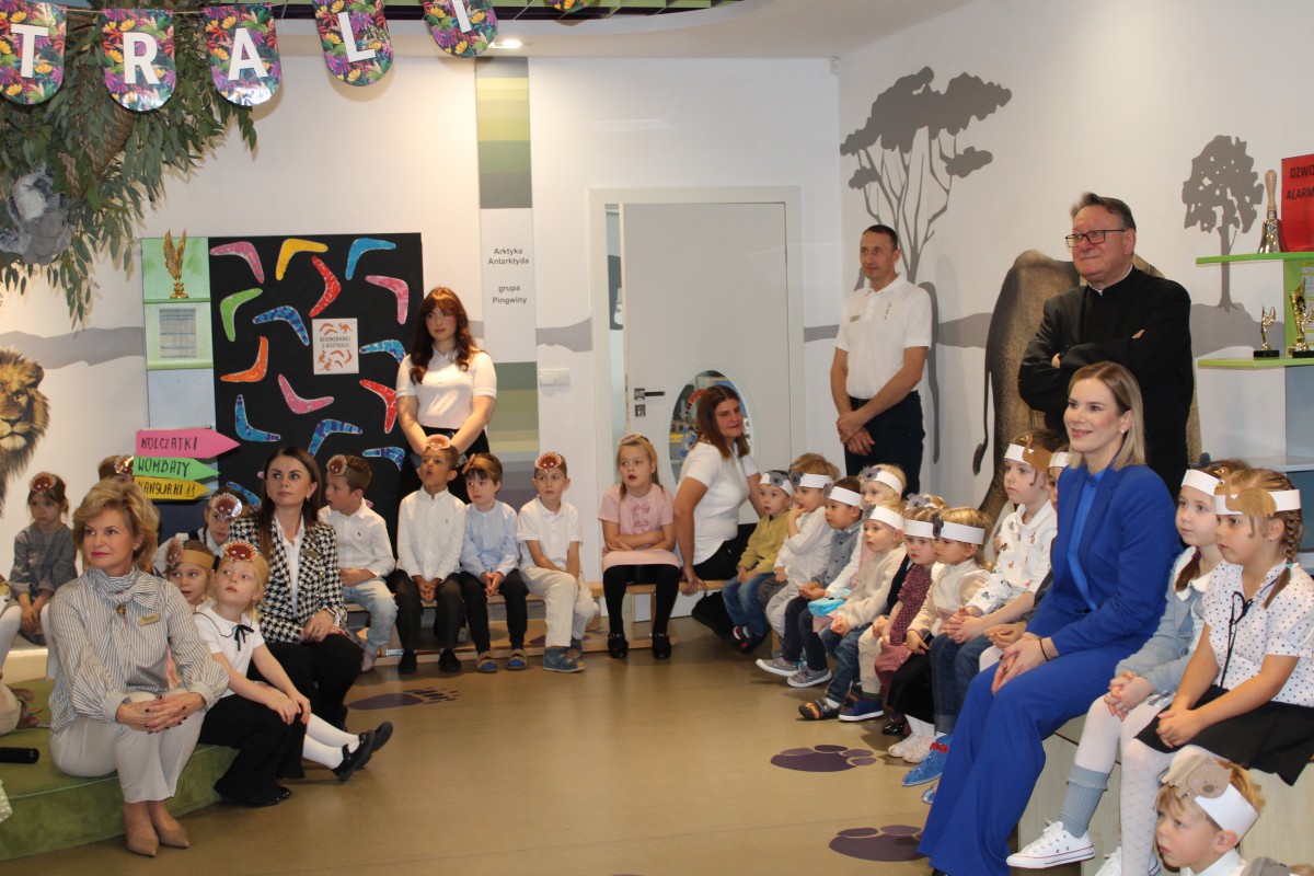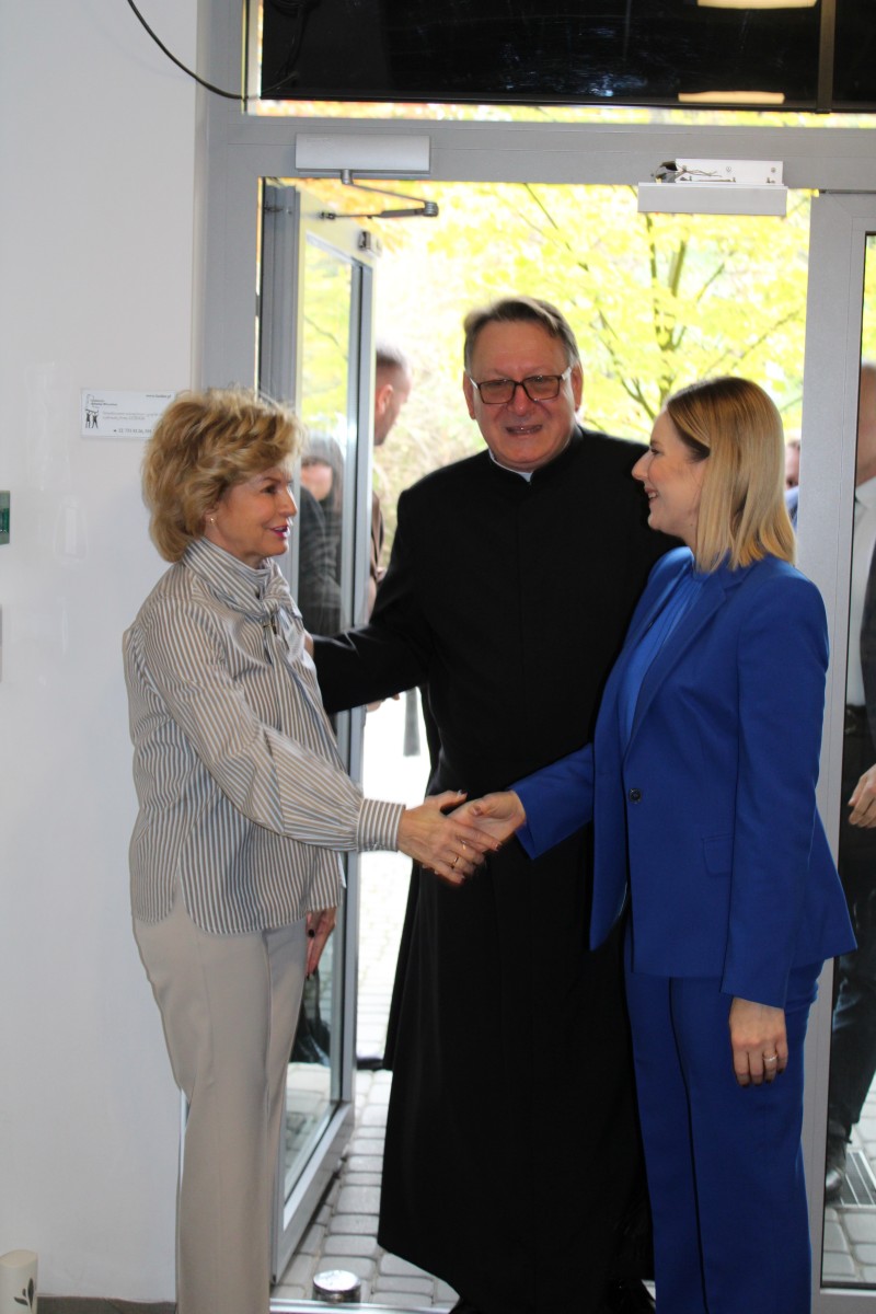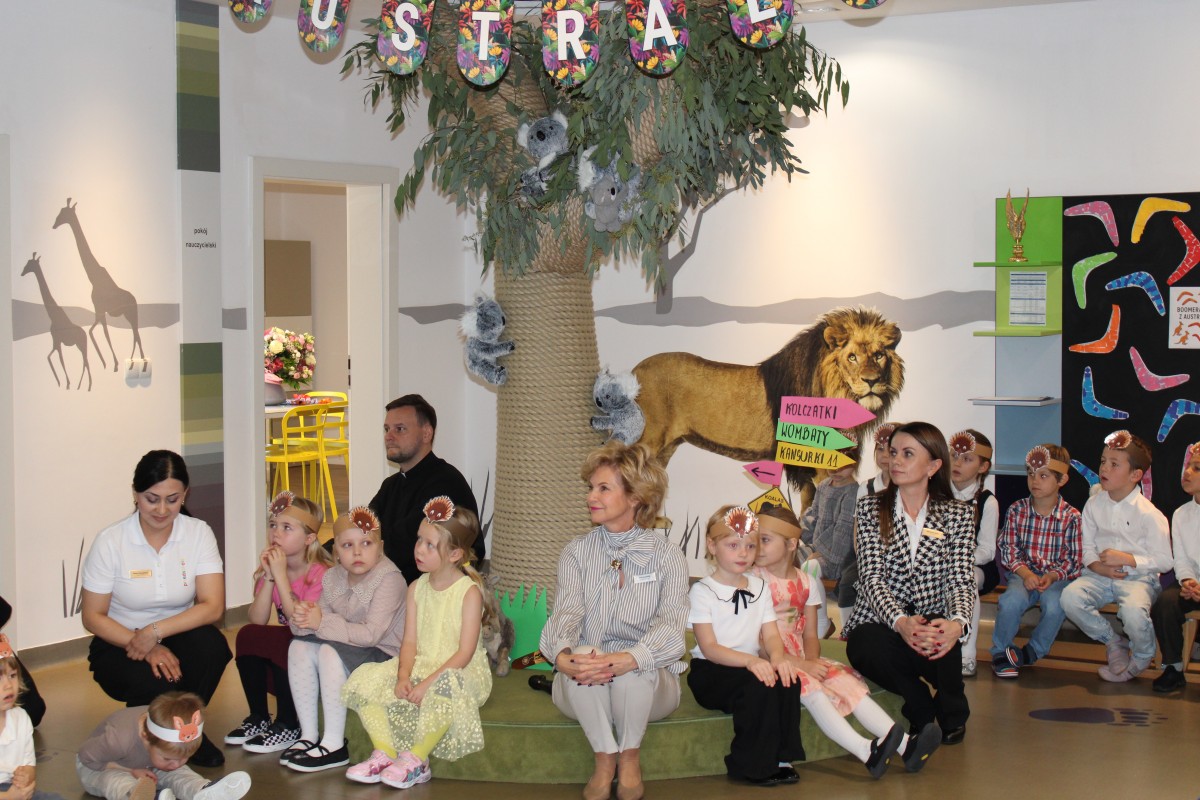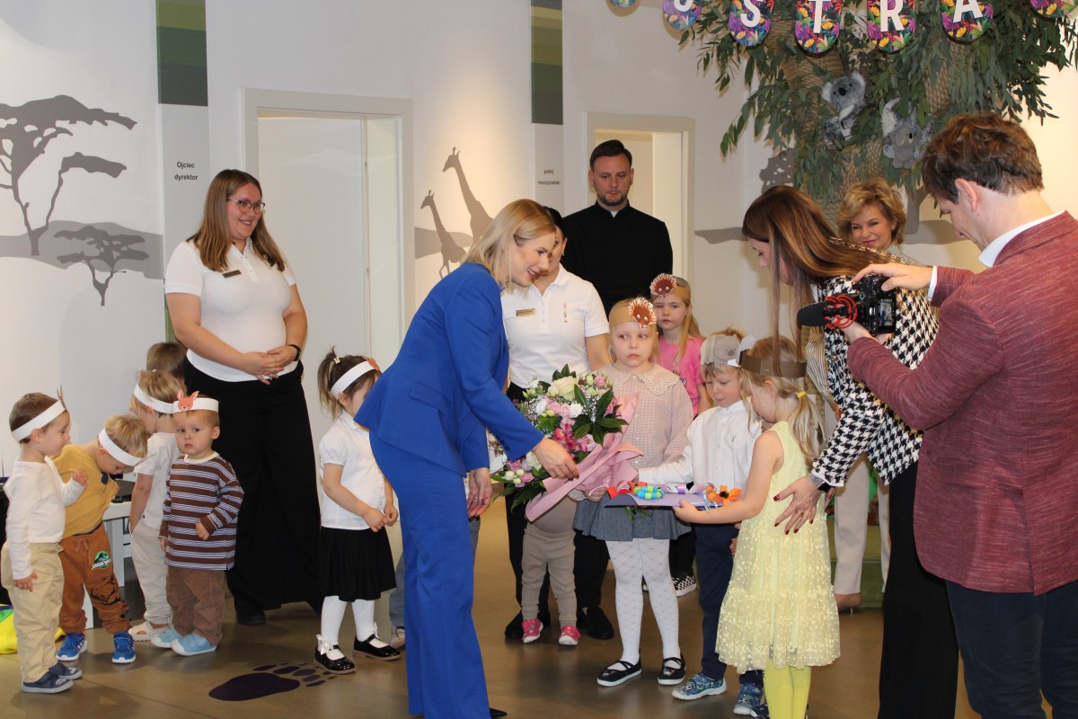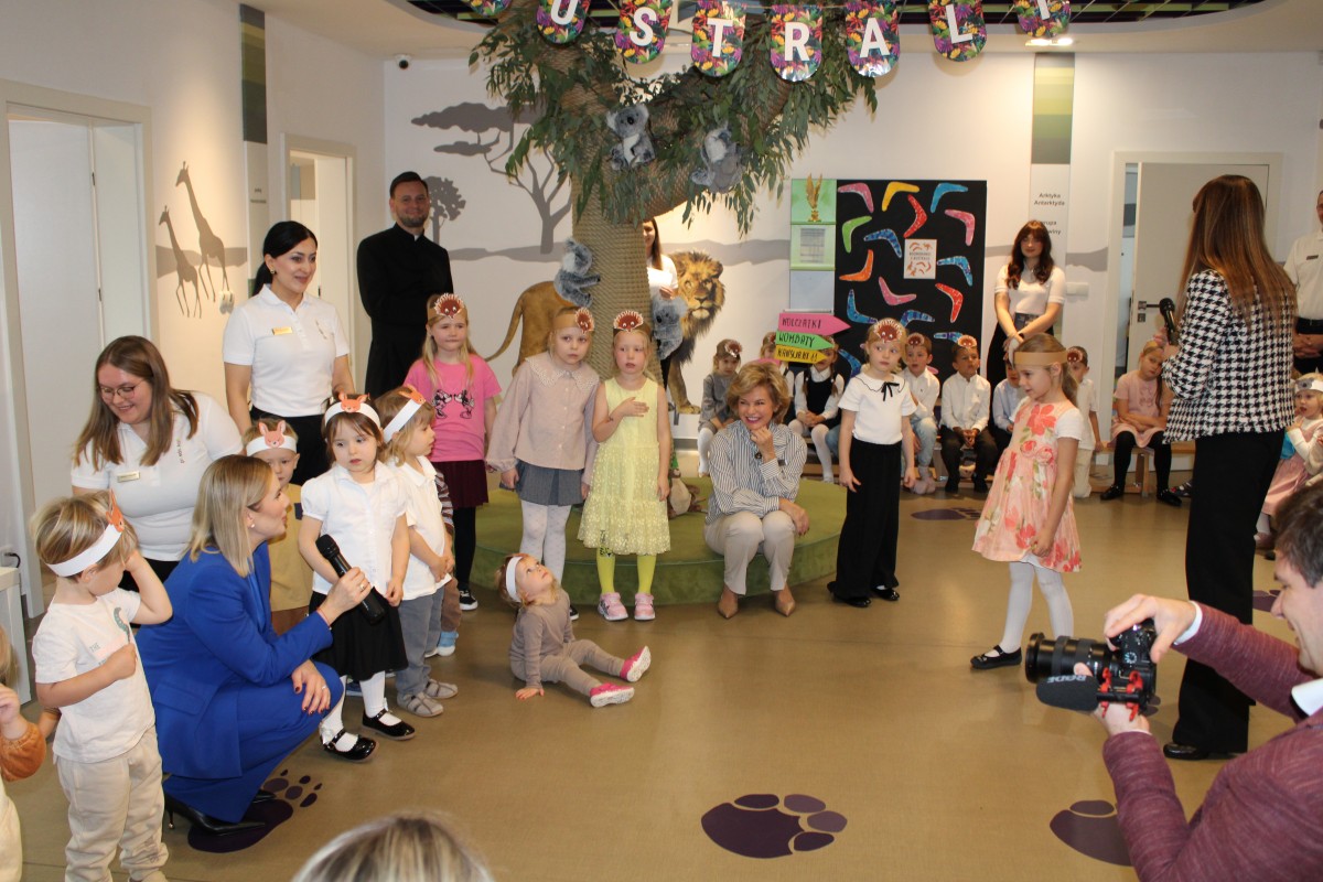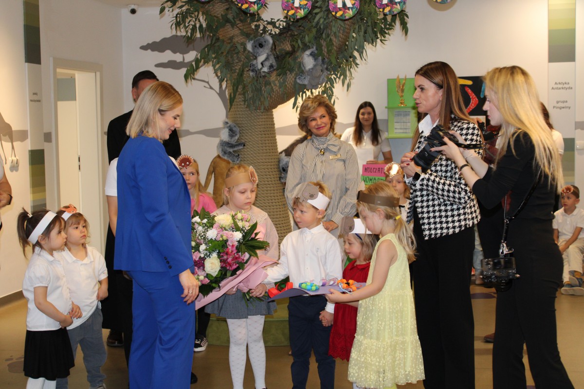 Wizyta Małżonki Prezydenta Polski, Pani Marty Nawrockiej w Pijarskim Przedszkolu w Warszawie, 13.10.2025 r.W ramach trwającego Jubileuszu Pijarskiego Przedszkola w Warszawie i przed dzień Święta Edukacji Narodowej odwiedziła nas Małżonka Prezydenta Polski - Pani Marta Nawrocka. Po przywitaniu przez Dyrekcję Przedszkola Panią Ewę, Panią Agnieszkę, o. Bogdana SP i o. Rafała SP, Rektora Kolegium Zakonu Pijarów Pierwsza Dama zwiedziła nasze przedszkole. Na początku zobaczyła salę poświęconą Państwu Halinie i Kazimierzowi Wąsowskich, naszym darczyńcom, następnie kuchnię a także spotkała się z jej personelem. Pani Dyrektor Ewa zapoznała naszego Gościa z historią Pijarskiego Przedszkola i pokazała galerię zdjęć z jego budowy. Dzieci z wychowawcami oraz pracownicy przedszkola były zebrane na holu pod Baobabem, gdzie Pani Dyrektor Ewa przywitała Małżonkę Prezydenta Polski, dzieci oraz pracowników przedszkola. Pani Wicedyrektor Agnieszka zaprosiła wszystkich do obejrzenia występu Grupy Kangury. W ramach programu „Mały Europejczyk zwiedza świat” dzieci z opiekunkami przedstawiły nam Australię i zwierzątka tam żyjące oraz zaśpiewały i zatańczyły piosenkę o kangurkach. Następnie dzieci z grupy Pingwiny zadawały małżonce Prezydenta Polski pytania. Po pytaniach przedszkole zaśpiewało piosenkę o św. Józefie Kalasancjuszu pt. „ W dalekiej Hiszpanii”. Następnie nasz Gość uczestniczył w warsztatach kulinarnych z grupą Pandy, gdzie wspólnie z dziećmi Pierwsza Dama robiła ciasteczka w kształcie kangurków. Na zakończenie delegacja dzieci podziękowała Małżonce Prezydenta Polski Pani Marcie Nawrockiej za wizytę wręczając własnoręcznie wykonaną laurkę oraz bukiet kwiatów.Wspólnota Pijarskiego Przedszkola w Warszawie bardzo dziękuje Pierwszej Damie za poświęcony czas, przemiłą wizytę oraz za prezenty przekazane wszystkim przedszkolakom i żłobkowiczom - piękne gry i książki.