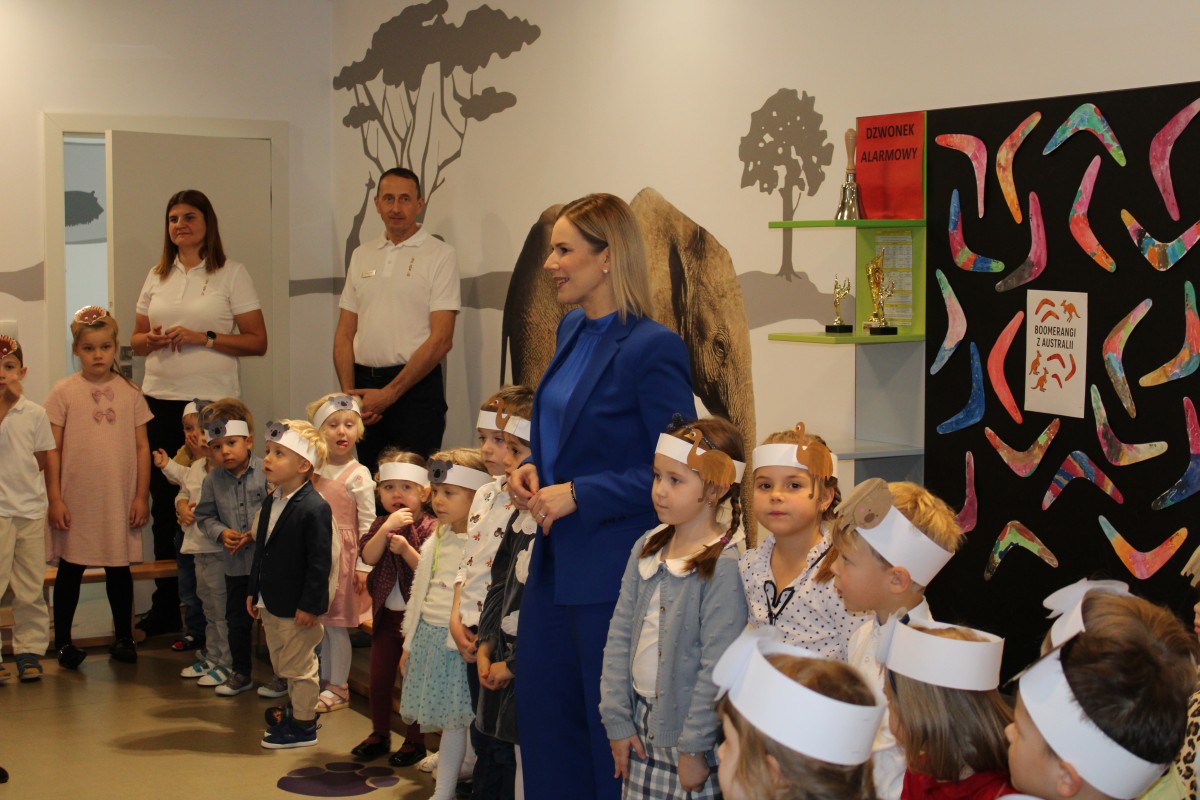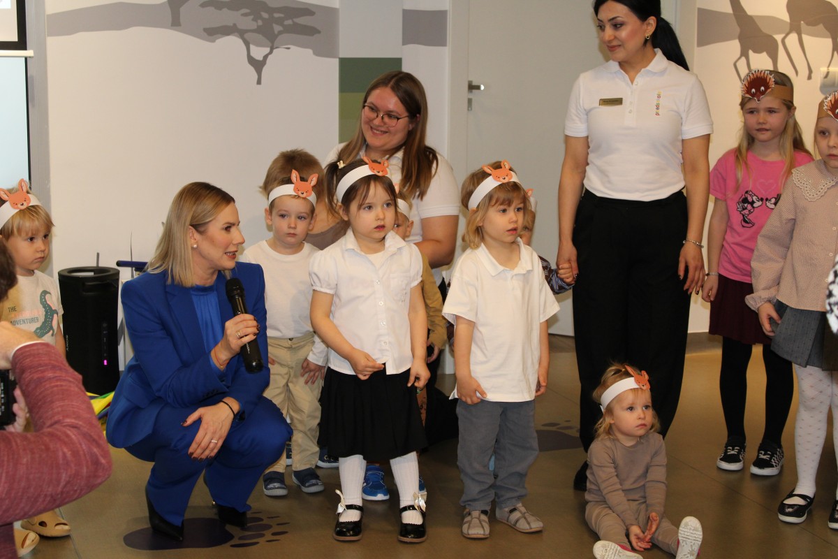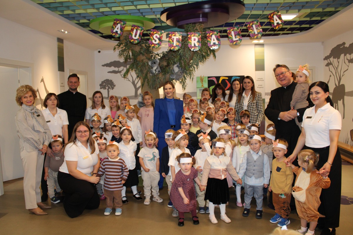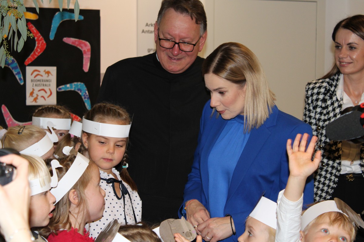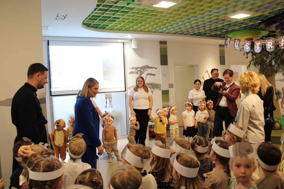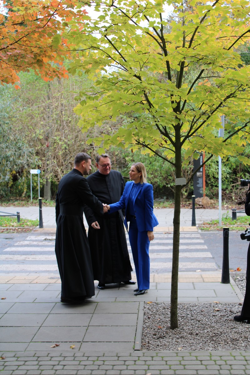 Wizyta Małżonki Prezydenta Polski, Pani Marty Nawrockiej w Pijarskim Przedszkolu w Warszawie, 13.10.2025 r.W ramach trwającego Jubileuszu Pijarskiego Przedszkola w Warszawie i przed dzień Święta Edukacji Narodowej odwiedziła nas Małżonka Prezydenta Polski - Pani Marta Nawrocka. Po przywitaniu przez Dyrekcję Przedszkola Panią Ewę, Panią Agnieszkę, o. Bogdana SP i o. Rafała SP, Rektora Kolegium Zakonu Pijarów Pierwsza Dama zwiedziła nasze przedszkole. Na początku zobaczyła salę poświęconą Państwu Halinie i Kazimierzowi Wąsowskich, naszym darczyńcom, następnie kuchnię a także spotkała się z jej personelem. Pani Dyrektor Ewa zapoznała naszego Gościa z historią Pijarskiego Przedszkola i pokazała galerię zdjęć z jego budowy. Dzieci z wychowawcami oraz pracownicy przedszkola były zebrane na holu pod Baobabem, gdzie Pani Dyrektor Ewa przywitała Małżonkę Prezydenta Polski, dzieci oraz pracowników przedszkola. Pani Wicedyrektor Agnieszka zaprosiła wszystkich do obejrzenia występu Grupy Kangury. W ramach programu „Mały Europejczyk zwiedza świat” dzieci z opiekunkami przedstawiły nam Australię i zwierzątka tam żyjące oraz zaśpiewały i zatańczyły piosenkę o kangurkach. Następnie dzieci z grupy Pingwiny zadawały małżonce Prezydenta Polski pytania. Po pytaniach przedszkole zaśpiewało piosenkę o św. Józefie Kalasancjuszu pt. „ W dalekiej Hiszpanii”. Następnie nasz Gość uczestniczył w warsztatach kulinarnych z grupą Pandy, gdzie wspólnie z dziećmi Pierwsza Dama robiła ciasteczka w kształcie kangurków. Na zakończenie delegacja dzieci podziękowała Małżonce Prezydenta Polski Pani Marcie Nawrockiej za wizytę wręczając własnoręcznie wykonaną laurkę oraz bukiet kwiatów.Wspólnota Pijarskiego Przedszkola w Warszawie bardzo dziękuje Pierwszej Damie za poświęcony czas, przemiłą wizytę oraz za prezenty przekazane wszystkim przedszkolakom i żłobkowiczom - piękne gry i książki.