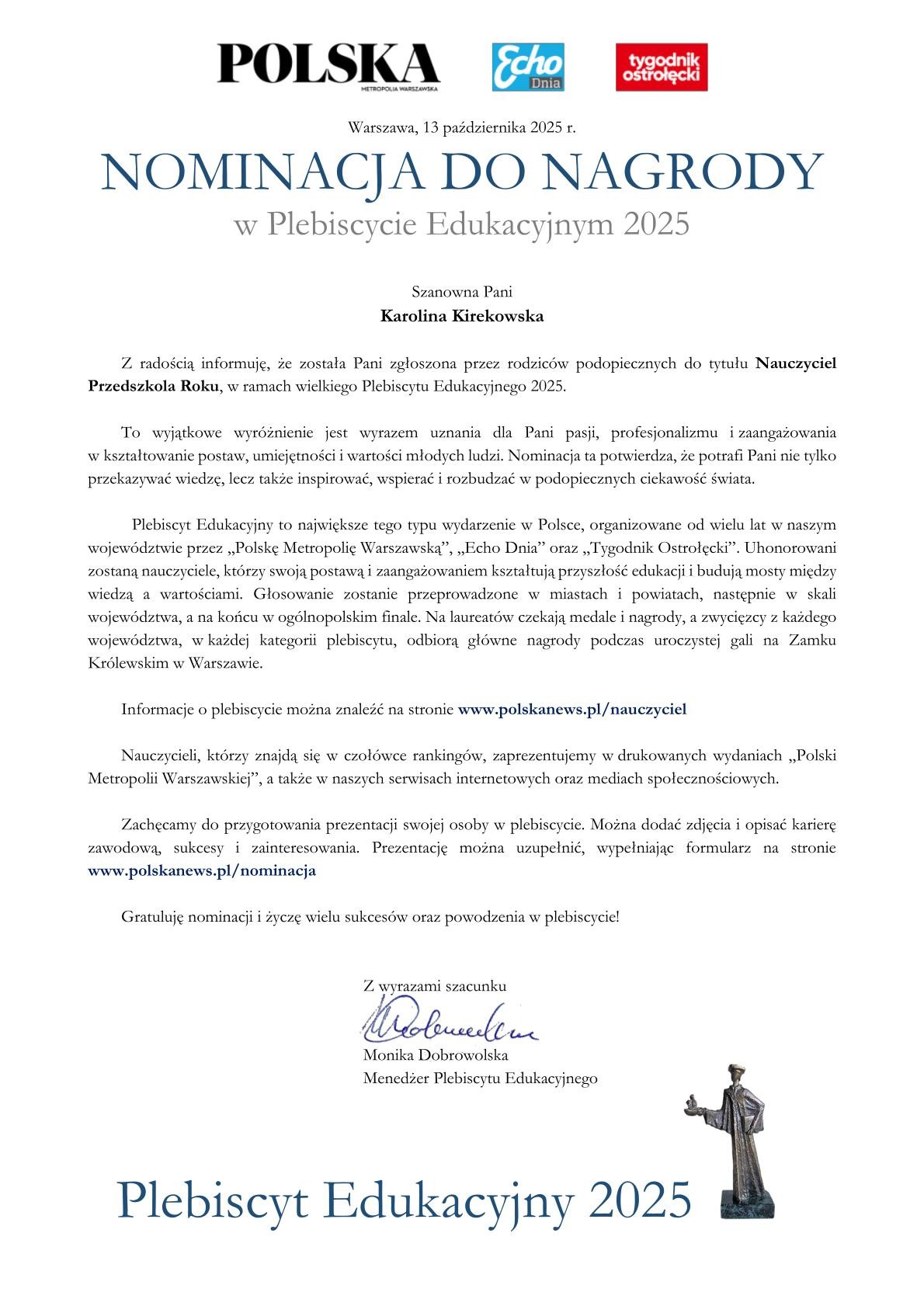 Uprzejmie informujemy, że nasze przedszkole zostało zgłoszone do nagrody w kategorii Przedszkole Roku w tegorocznej edycji Plebiscytu Edukacyjnego 2025. Ponadto nominację do nagrody dla najlepszych nauczycieli otrzymała Pani Karolina Kirekowska. Głosować w plebiscycie można od dzisiaj, tj. od 21 października. Wszystkie informacje o akcji można znaleźć w serwisie internetowym pod adresem: www.polskanews.pl/nauczyciel Szczegółowe informacje na temat przetwarzania danych osobowych oraz regulamin plebiscytu dostępne są na stronie: www.polskanews.pl/rpe