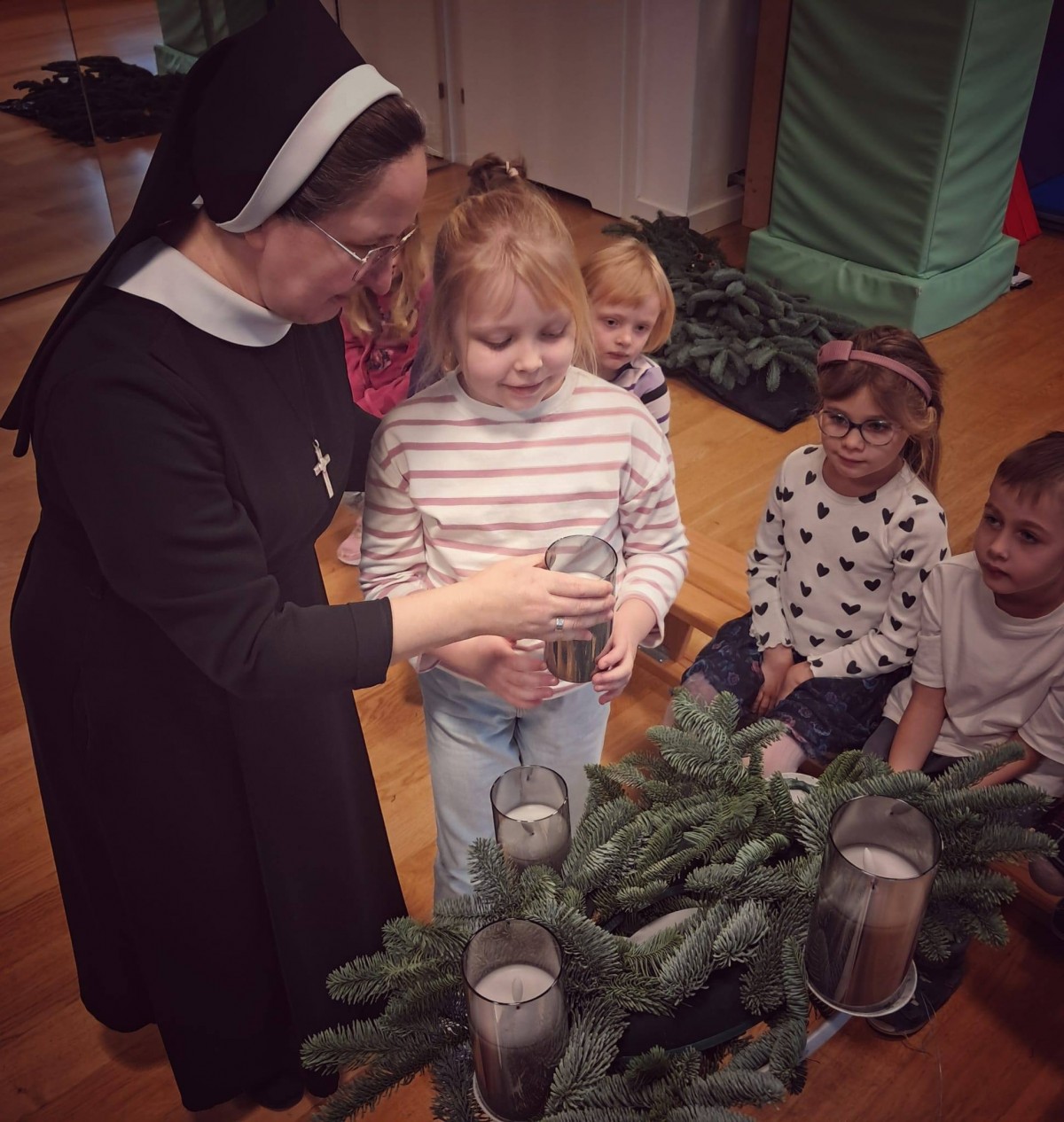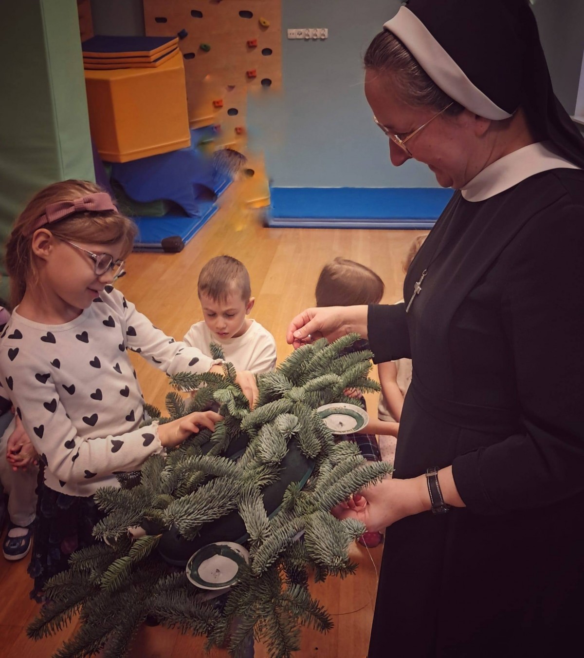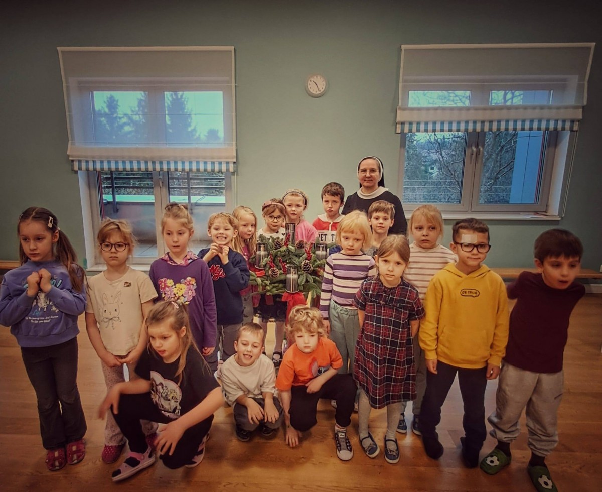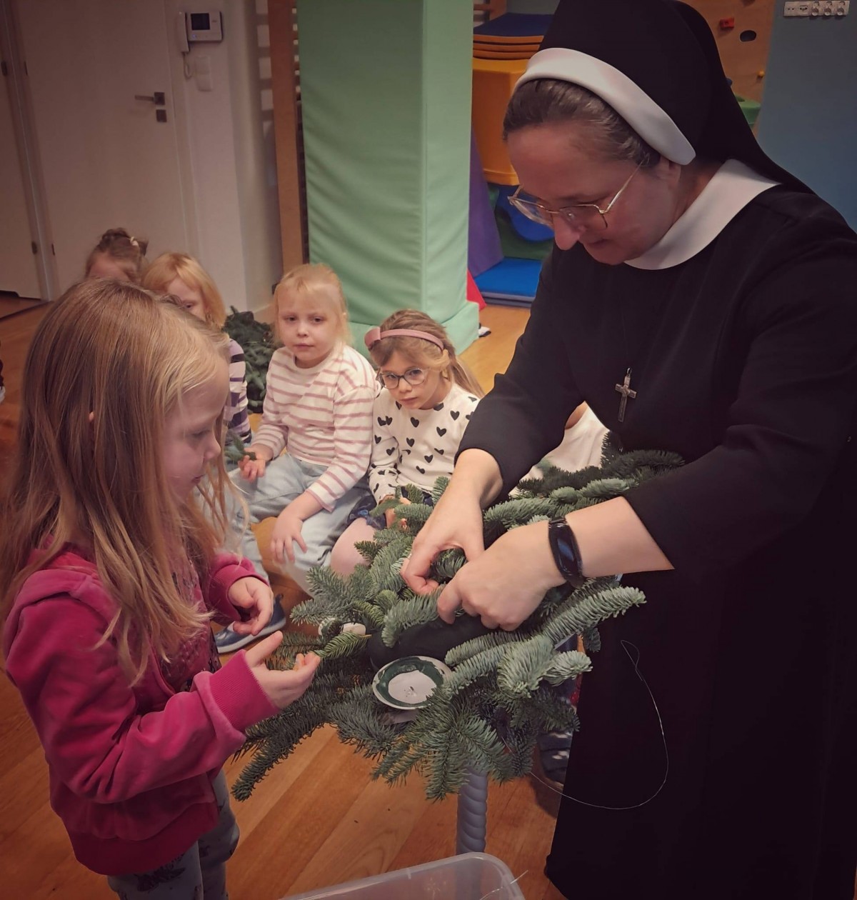 W dniu dzisiejszym dzieci z grupy Pingwiny na zajęciach z religii wykonały razem z Siostrą Anną piękny wieniec adwentowy, który towarzyszyć nam będzie w oczekiwaniu na Święta Bożego Narodzenia. Wieniec adwentowy z czterema świecami odnosi się do czterech aspektów adwentu: nadziei, pokoju, radości i miłości. Każda świeca reprezentuje jedną z tych wartości, a ich kolejne zapalanie symbolizuje przybliżanie się do świąt Bożego Narodzenia.