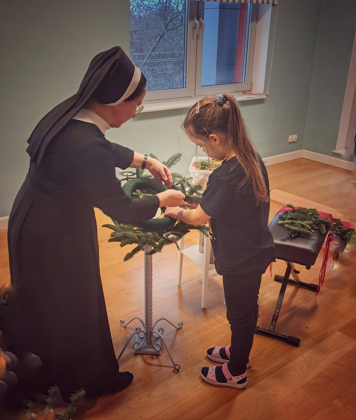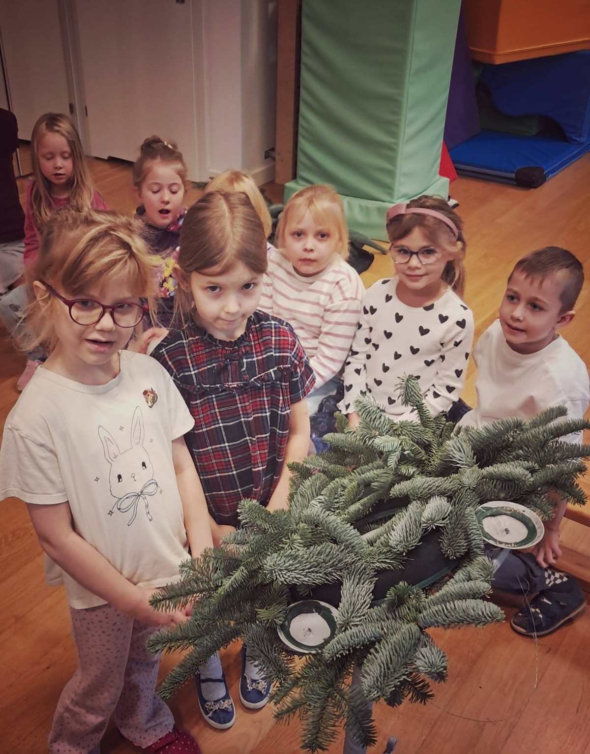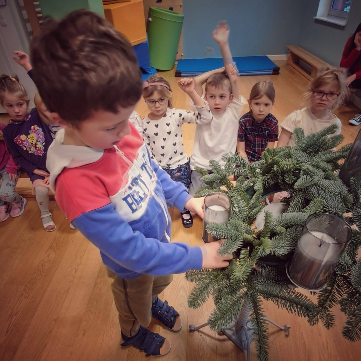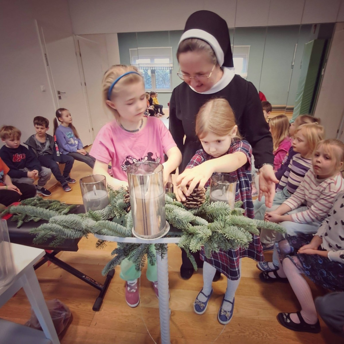 W dniu dzisiejszym dzieci z grupy Pingwiny na zajęciach z religii wykonały razem z Siostrą Anną piękny wieniec adwentowy, który towarzyszyć nam będzie w oczekiwaniu na Święta Bożego Narodzenia. Wieniec adwentowy z czterema świecami odnosi się do czterech aspektów adwentu: nadziei, pokoju, radości i miłości. Każda świeca reprezentuje jedną z tych wartości, a ich kolejne zapalanie symbolizuje przybliżanie się do świąt Bożego Narodzenia.