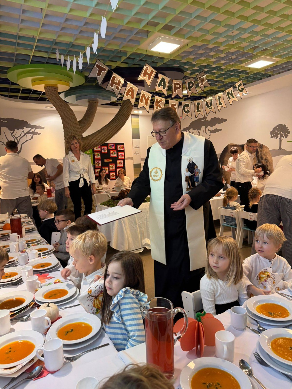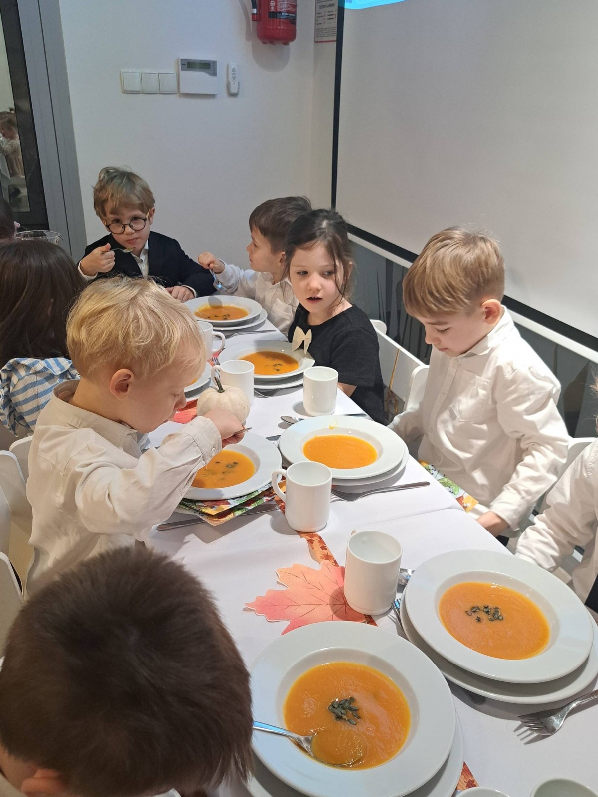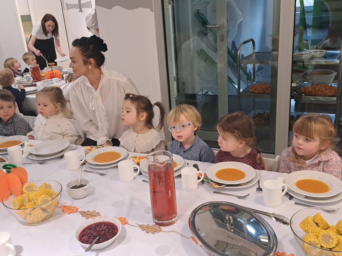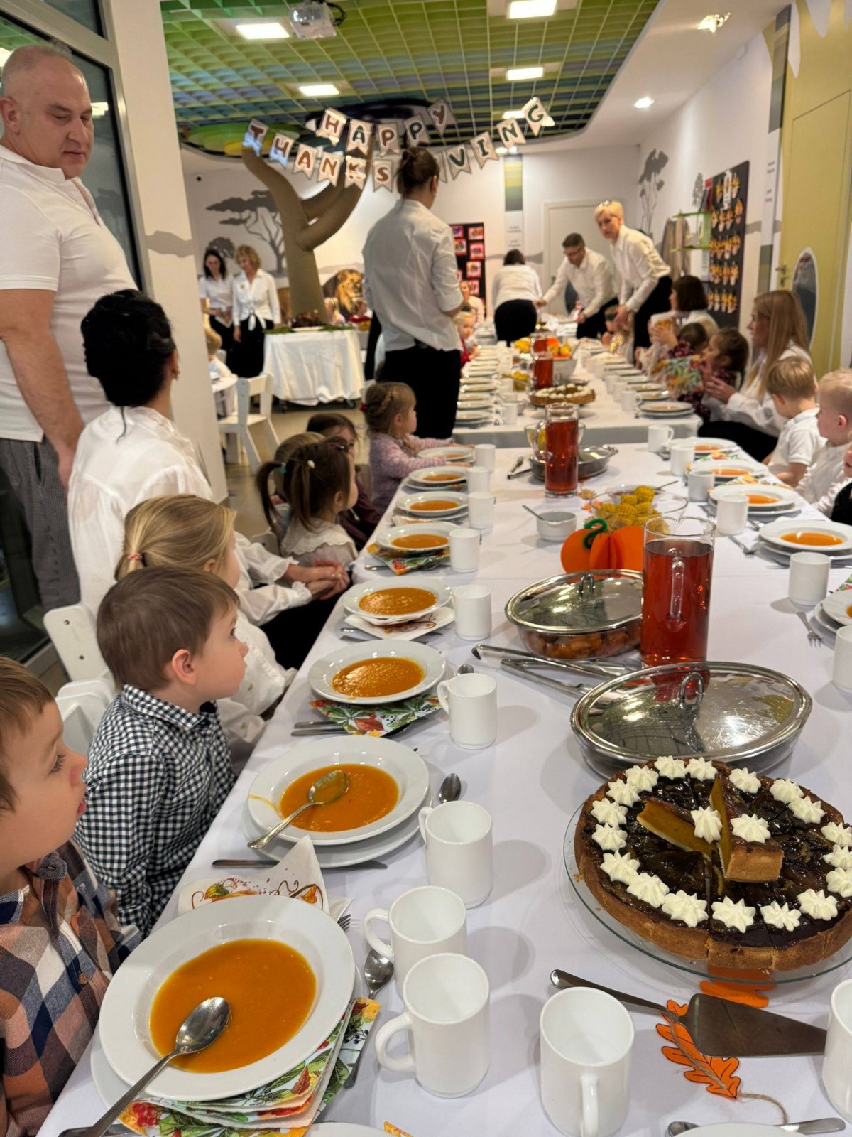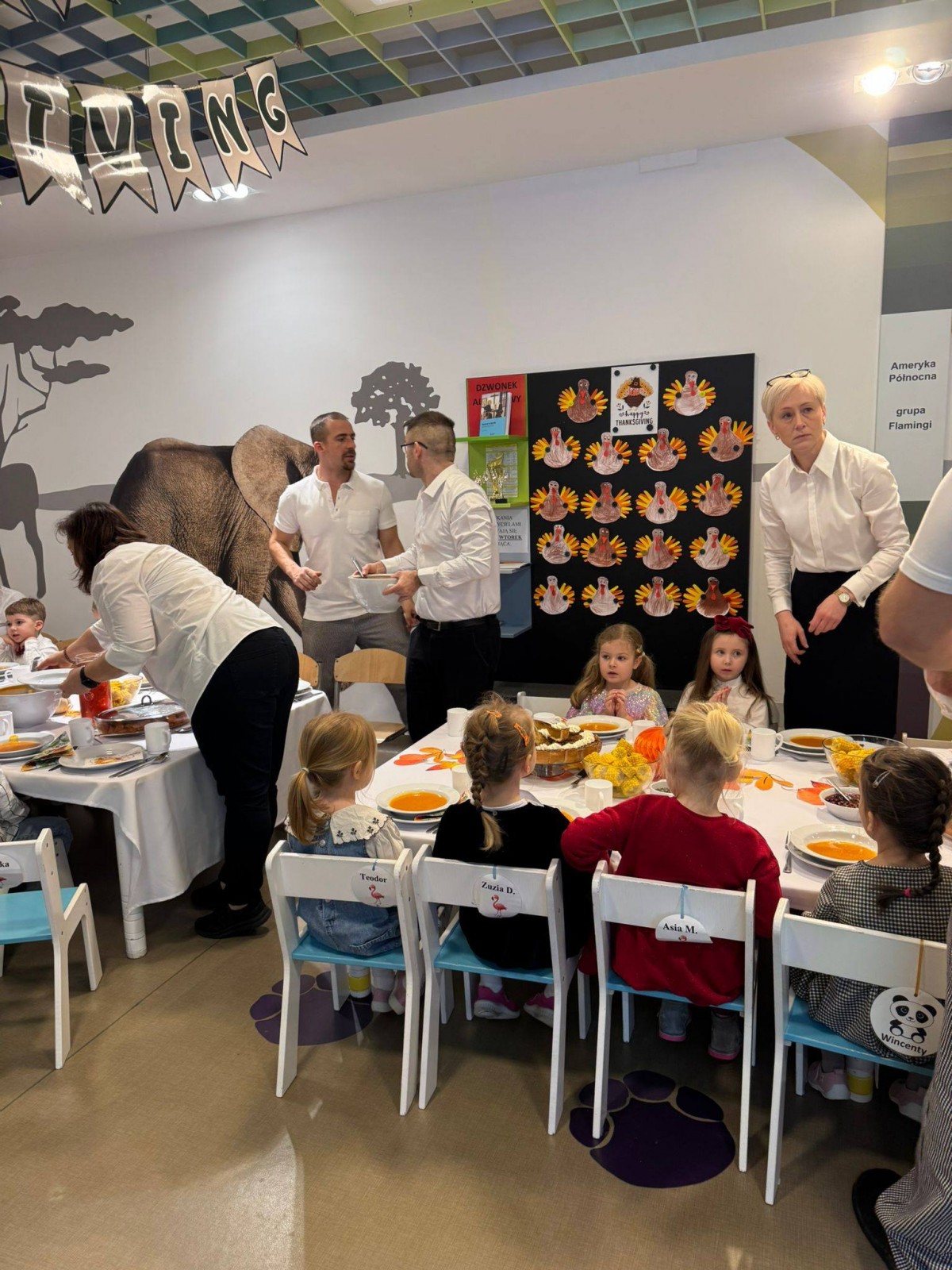 Dzisiaj nasze przedszkole wypełniło się wyjątkową atmosferą Święta Dziękczynienia. To piękna tradycja, która sięga 1621 roku, kiedy osadnicy z Plymouth, wraz z rdzenną ludnością Ameryki, po raz pierwszy zasiedli razem do stołu, by w jedności i wdzięczności podziękować Bogu za życie, plony i wzajemną życzliwość. Ta historia wciąż przypomina, jak ważne jest zatrzymanie się i dostrzeżenie dobra, które otrzymujemy każdego dnia od Pana Boga.Właśnie w tym duchu usiedliśmy dziś wszyscy do wspólnego, przedszkolnego stołu.A nasze dzieci były absolutnie cudowne. Podczas posiłku dziękowały za to, co dla nich najważniejsze: za rodzinę, rodziców, rodzeństwo, za swoje panie, za rytmikę, za angielski i hiszpański za zabawki, za przedszkole i za pokój na świecie. Ich proste, szczere słowa wzruszały i przypominały, jak wiele piękna kryje się w dziecięcej wdzięczności.Na naszych stołach nie zabrakło tradycyjnych potraw: pysznego indyka, smakowitych dodatków i obowiązkowego ciasta dyniowego.Z serca dziękujemy naszym kucharzom za pracę, której owocem był ten niezwykły posiłek. To był dzień pełen ciepła, wdzięczności i bycia razem.Dzień, który na długo zostanie w naszej pamięci.
