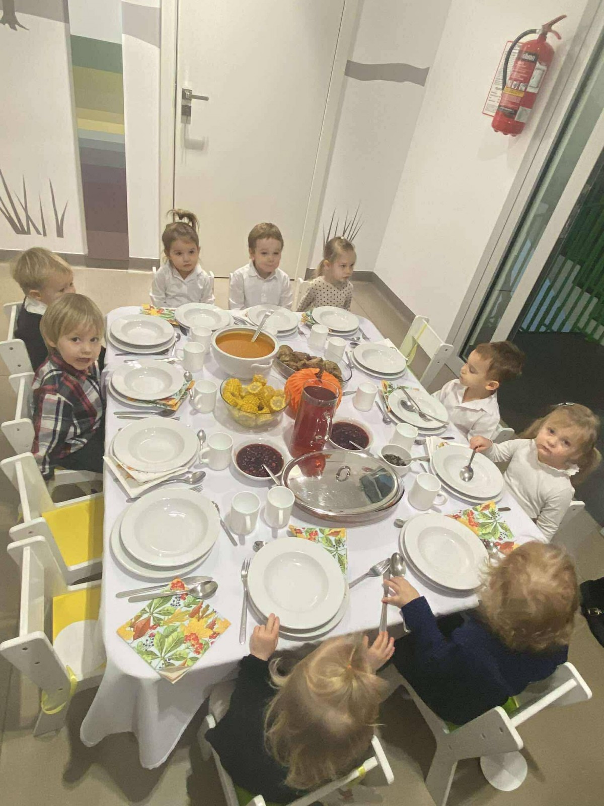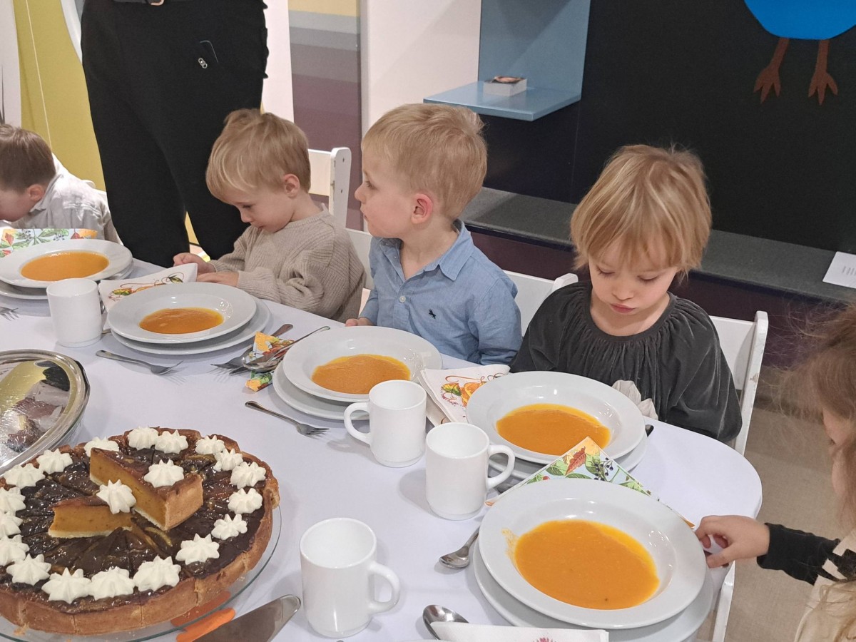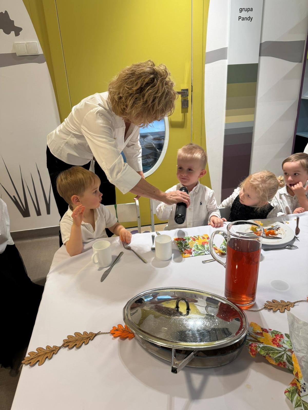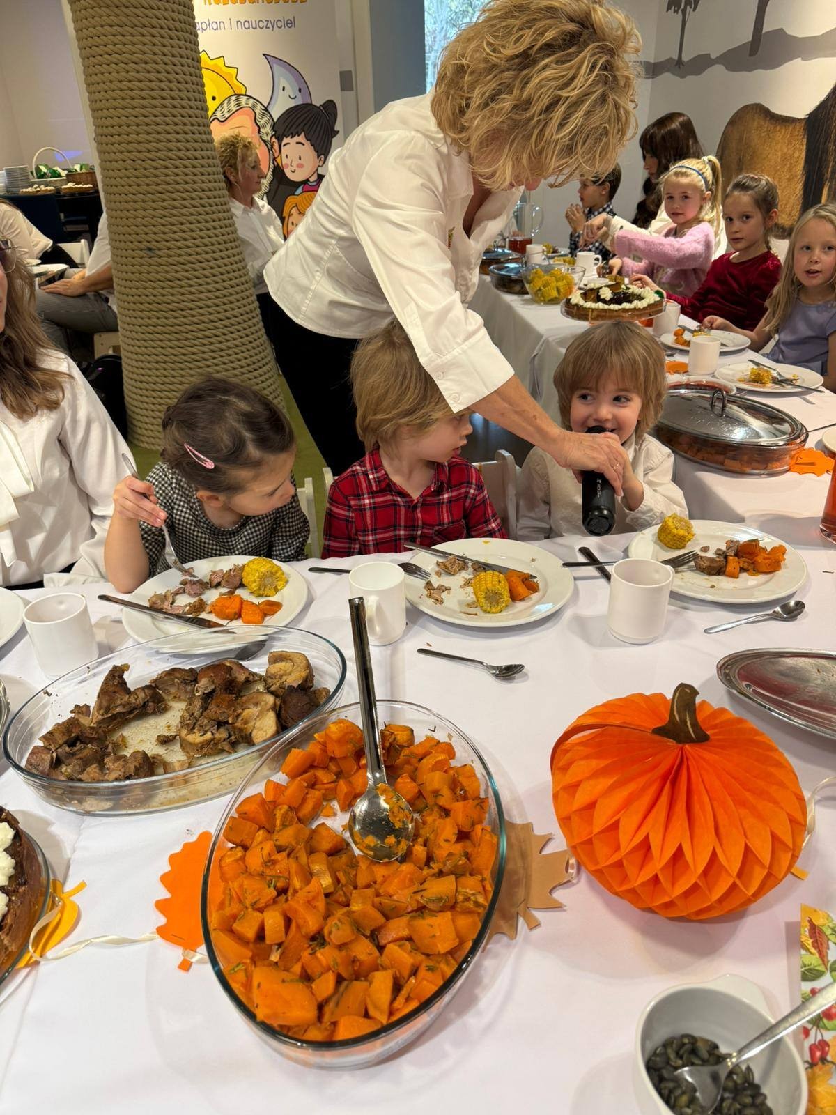 Dzisiaj nasze przedszkole wypełniło się wyjątkową atmosferą Święta Dziękczynienia. To piękna tradycja, która sięga 1621 roku, kiedy osadnicy z Plymouth, wraz z rdzenną ludnością Ameryki, po raz pierwszy zasiedli razem do stołu, by w jedności i wdzięczności podziękować Bogu za życie, plony i wzajemną życzliwość. Ta historia wciąż przypomina, jak ważne jest zatrzymanie się i dostrzeżenie dobra, które otrzymujemy każdego dnia od Pana Boga.Właśnie w tym duchu usiedliśmy dziś wszyscy do wspólnego, przedszkolnego stołu.A nasze dzieci były absolutnie cudowne. Podczas posiłku dziękowały za to, co dla nich najważniejsze: za rodzinę, rodziców, rodzeństwo, za swoje panie, za rytmikę, za angielski i hiszpański za zabawki, za przedszkole i za pokój na świecie. Ich proste, szczere słowa wzruszały i przypominały, jak wiele piękna kryje się w dziecięcej wdzięczności.Na naszych stołach nie zabrakło tradycyjnych potraw: pysznego indyka, smakowitych dodatków i obowiązkowego ciasta dyniowego.Z serca dziękujemy naszym kucharzom za pracę, której owocem był ten niezwykły posiłek. To był dzień pełen ciepła, wdzięczności i bycia razem.Dzień, który na długo zostanie w naszej pamięci.
