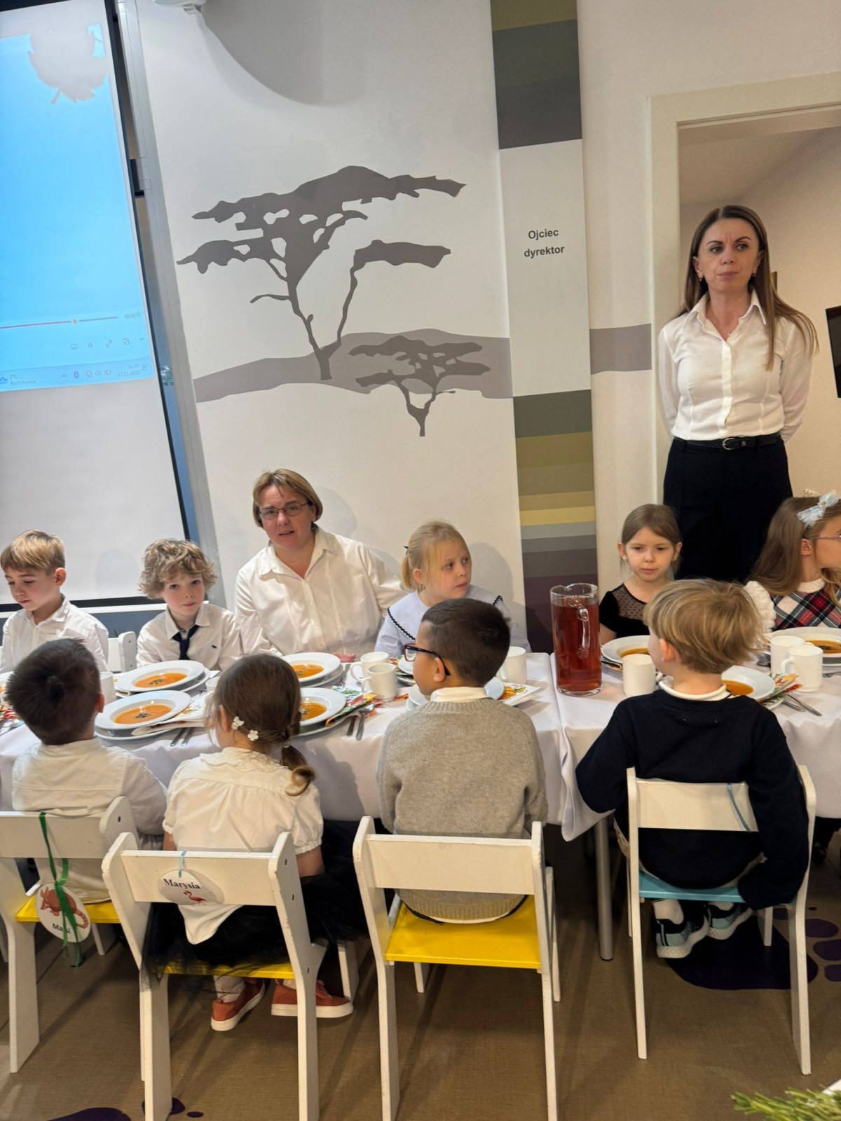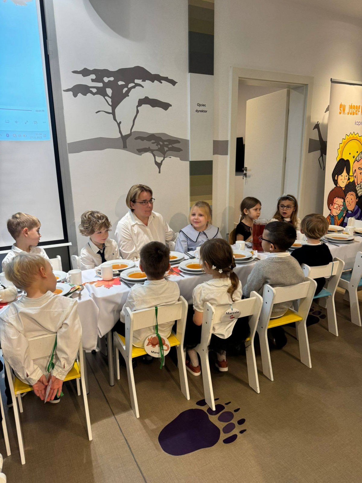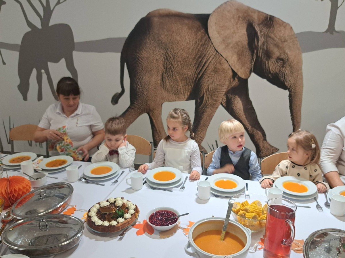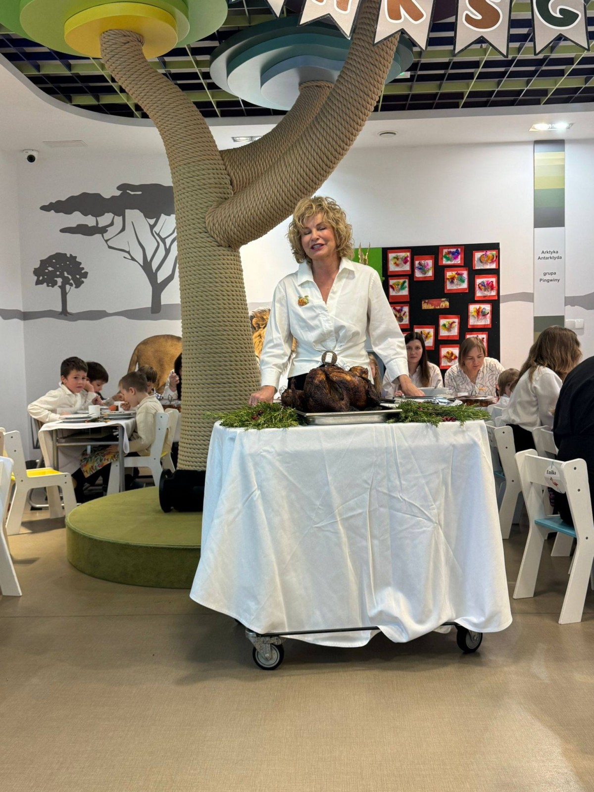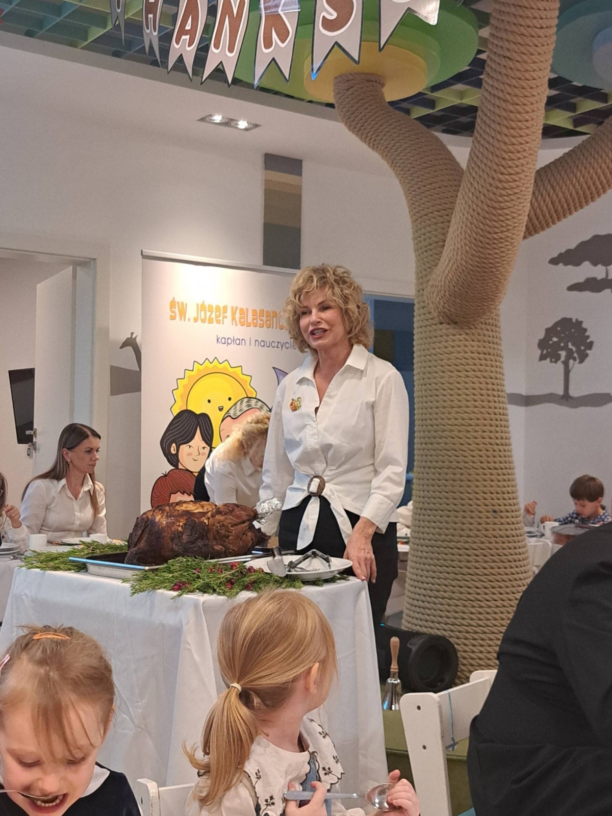 Dzisiaj nasze przedszkole wypełniło się wyjątkową atmosferą Święta Dziękczynienia. To piękna tradycja, która sięga 1621 roku, kiedy osadnicy z Plymouth, wraz z rdzenną ludnością Ameryki, po raz pierwszy zasiedli razem do stołu, by w jedności i wdzięczności podziękować Bogu za życie, plony i wzajemną życzliwość. Ta historia wciąż przypomina, jak ważne jest zatrzymanie się i dostrzeżenie dobra, które otrzymujemy każdego dnia od Pana Boga.Właśnie w tym duchu usiedliśmy dziś wszyscy do wspólnego, przedszkolnego stołu.A nasze dzieci były absolutnie cudowne. Podczas posiłku dziękowały za to, co dla nich najważniejsze: za rodzinę, rodziców, rodzeństwo, za swoje panie, za rytmikę, za angielski i hiszpański za zabawki, za przedszkole i za pokój na świecie. Ich proste, szczere słowa wzruszały i przypominały, jak wiele piękna kryje się w dziecięcej wdzięczności.Na naszych stołach nie zabrakło tradycyjnych potraw: pysznego indyka, smakowitych dodatków i obowiązkowego ciasta dyniowego.Z serca dziękujemy naszym kucharzom za pracę, której owocem był ten niezwykły posiłek. To był dzień pełen ciepła, wdzięczności i bycia razem.Dzień, który na długo zostanie w naszej pamięci.