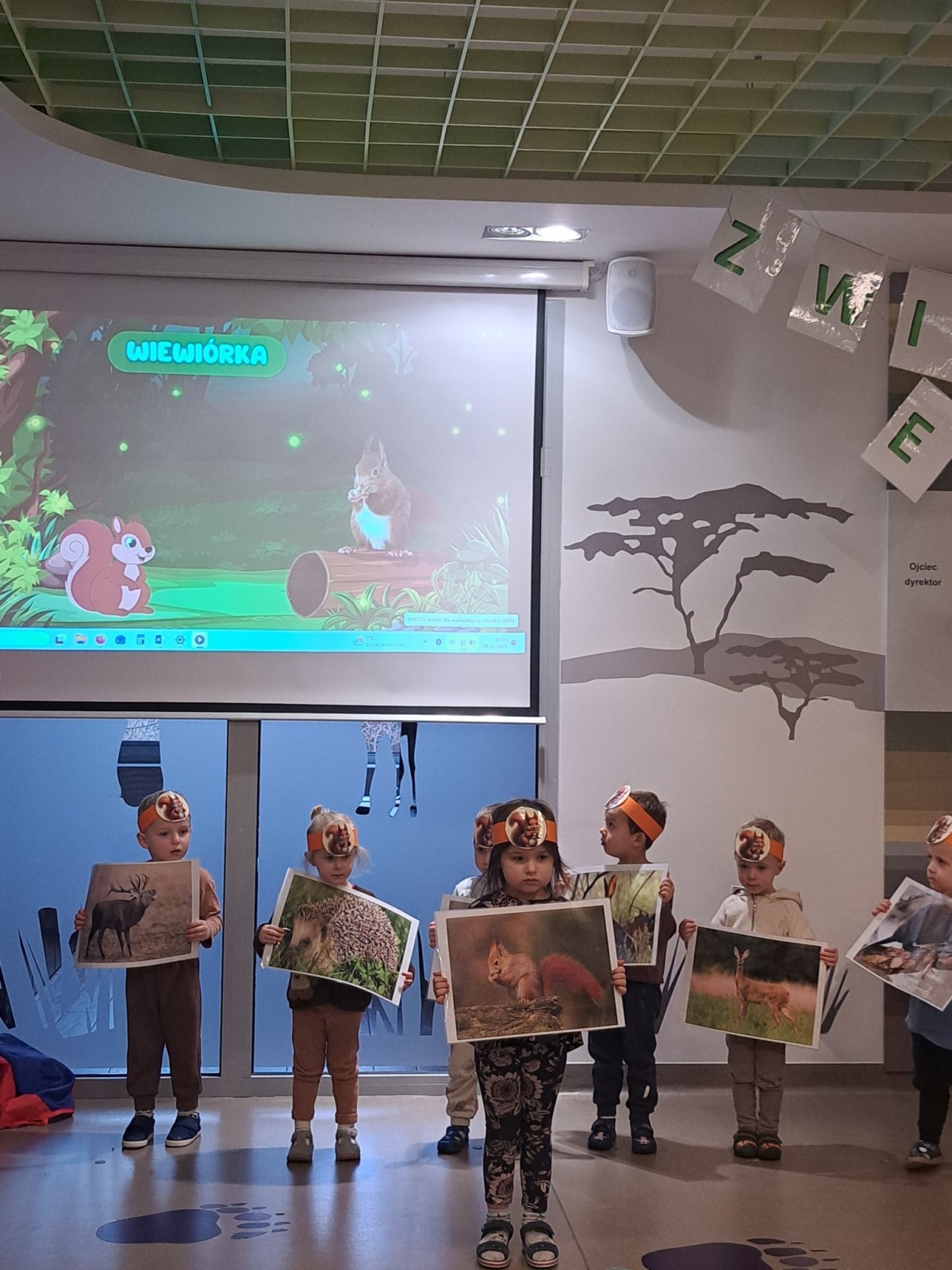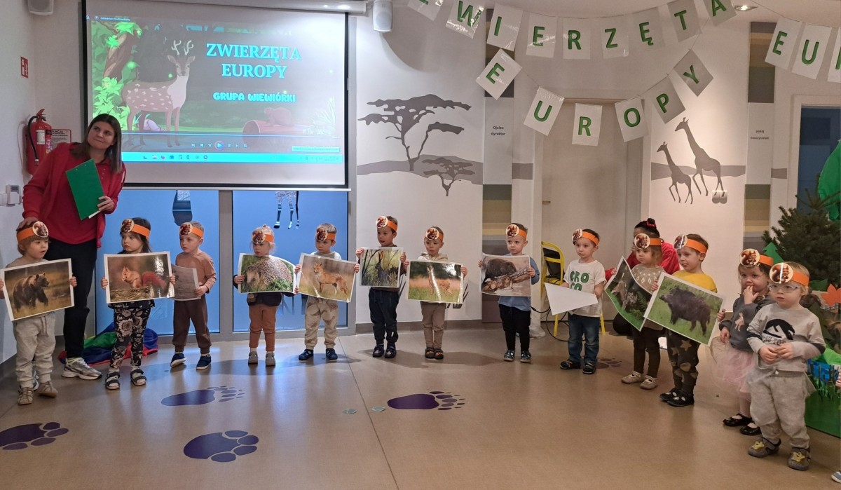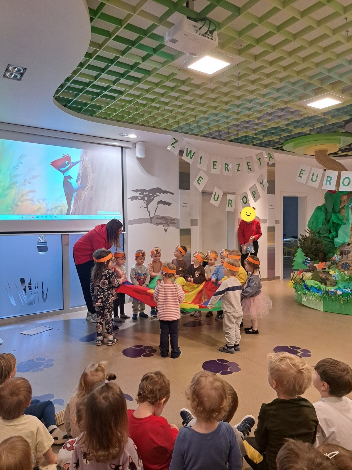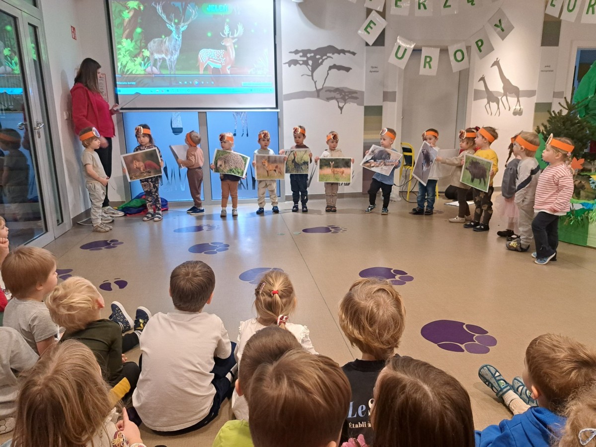 W ramach Klubu Małego Europejczyka, grupa Wiewiórki przygotowała występ na temat Zwierząt Europy- dzików saren, jeleni oraz wiewiórek. Dzieci przedstawiły poszczególne zwierzęta na zdjęciach, opowiedziały o nich oraz zatańczyły kolorowy taniec z chustą Na sam koniec, nauczycielki z grupy zorganizowały quiz wiedzy o zwierzętach oraz słuchowisko Bardzo dziękujemy za uroczy występ!