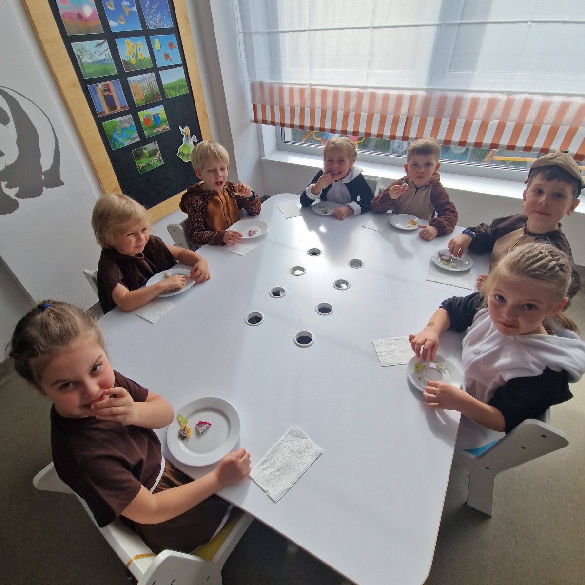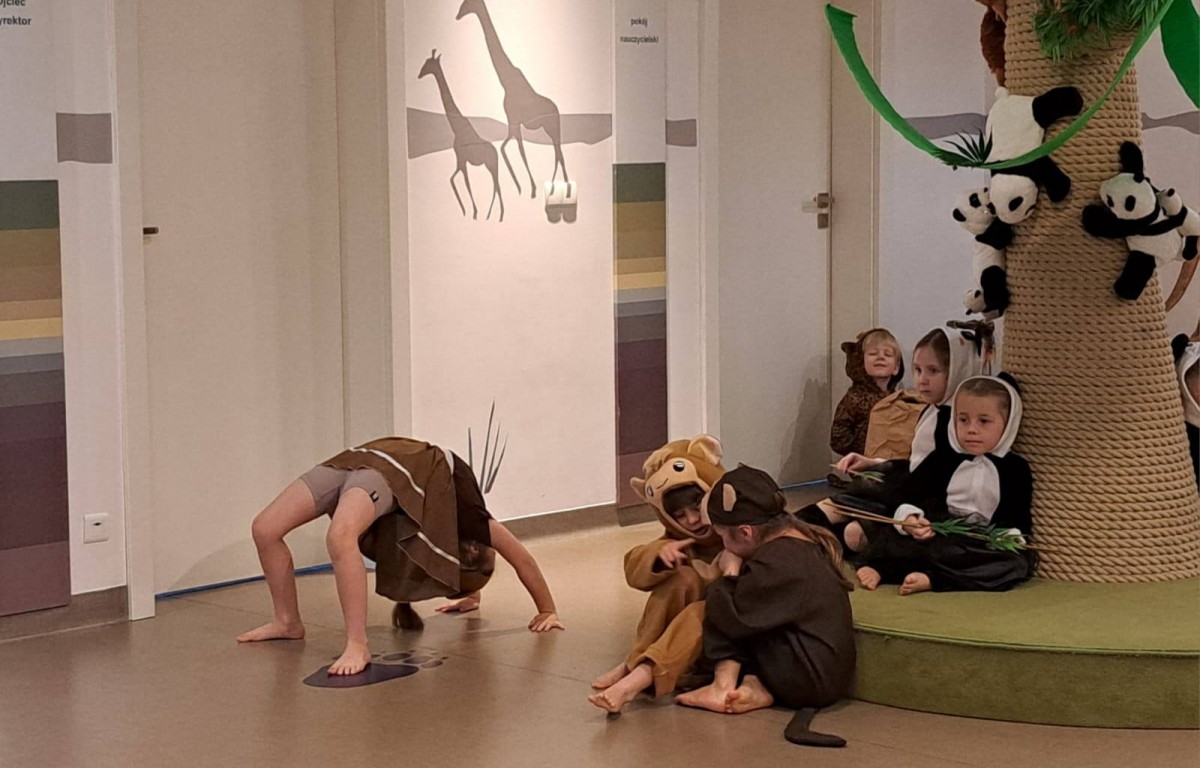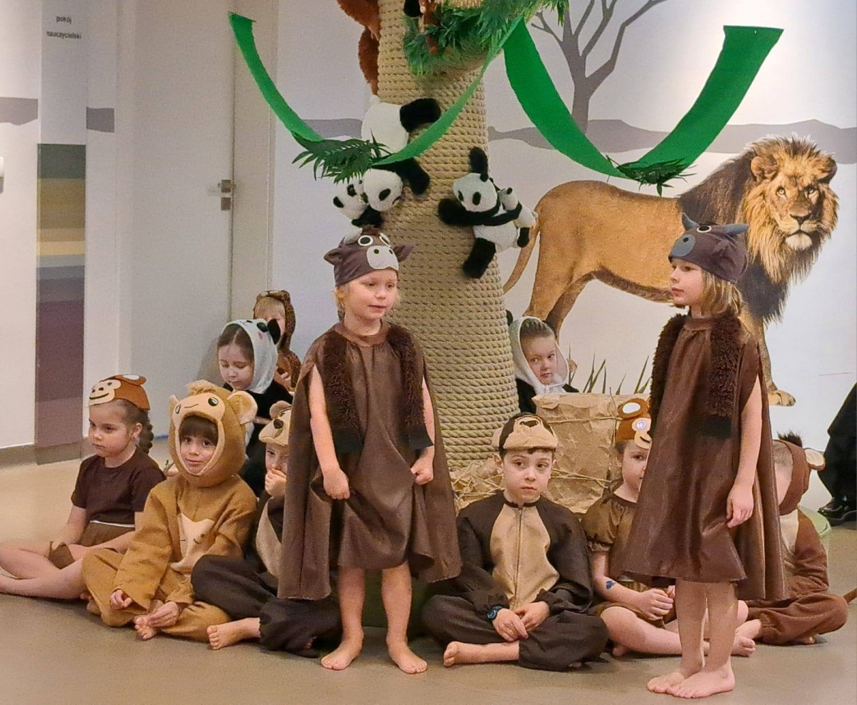 Dziś grupa „Pandy” zabrała nas w wyjątkową podróż do Azji.Dzieci opowiedziały historię o Wielkim Wąwozie Azjatyckim, miejscu niezwykłym i pełnym tajemnic. To właśnie tam spotkali się wyjątkowi goście z różnych zakątków kontynentu. Na przyjęcie przybyły Pandy, Lamparty, Gibony, Orangutany oraz Bawoły. Każde zwierzę miało swoją opowieść, swoje zwyczaje. Dzieci nie tylko świetnie wcieliły się w swoje role, ale też pokazały, że potrafią współpracować i z zaangażowaniem odkrywać świat.To była piękna lekcja o różnorodności, przyjaźni i o tym, że choć mieszkamy w różnych miejscach, możemy spotkać się razem i stworzyć coś wyjątkowego.Po występie czekała na nas jeszcze jedna niespodzianka – wspólna degustacja azjatyckich owoców. Mieliśmy okazję spróbować liczi, smoczego owocu, rambutanu, marakui oraz karamboli. To była prawdziwa podróż smaków i świetne zakończenie naszego azjatyckiego dnia.